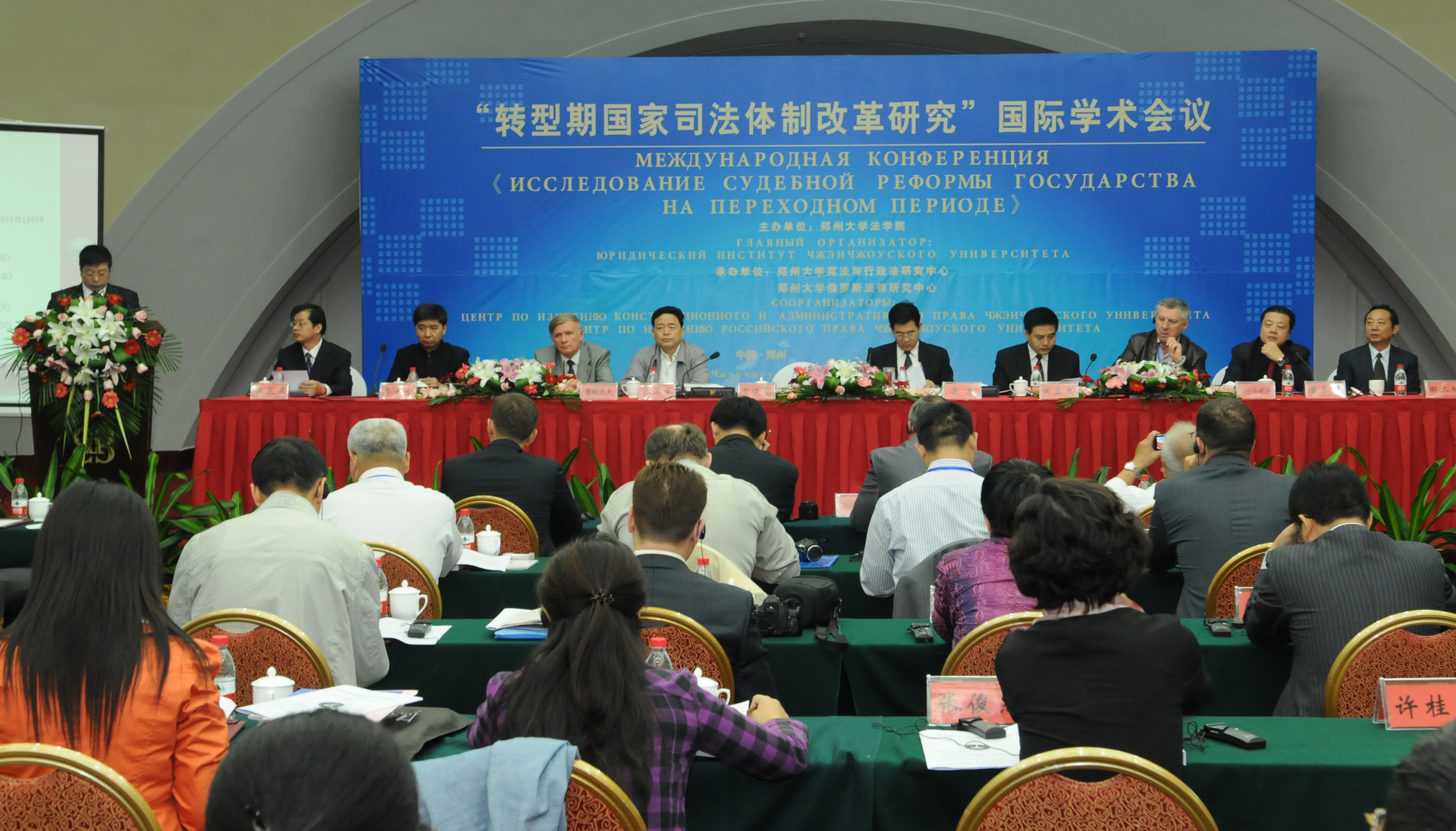 由pp电子法学院主办的国际学术研讨会10月13日在郑州召开。陕西省委常委、政法委书记、高级人民法院院长安东,河南省高级人民法院常务副院长田立文,河南省检察院常务副检察长张国臣,中国宪法学研究会副会长董和平教授,中国社科院俄罗斯东欧中亚研究所副所长李永全教授,pp电子副校长常俊标出席了会议。会议特别邀请了俄罗斯联邦功勋法学家、退休高级法官、奔萨国立大学司法教研室主任В.А.捷廖欣教授,俄罗斯联邦功勋法学家、俄罗斯科学院国家与法研究所萨拉托夫分所所长А.В. 马利科教授,俄罗斯联邦功勋法学家、贝加尔国立经济与法律大学副校长В·Н·安德里亚诺夫教授与会。来自中国社会科学院、中国青年政治学院、山东大学、西南政法大学的80余名国内外专家学者参加了本次会议。