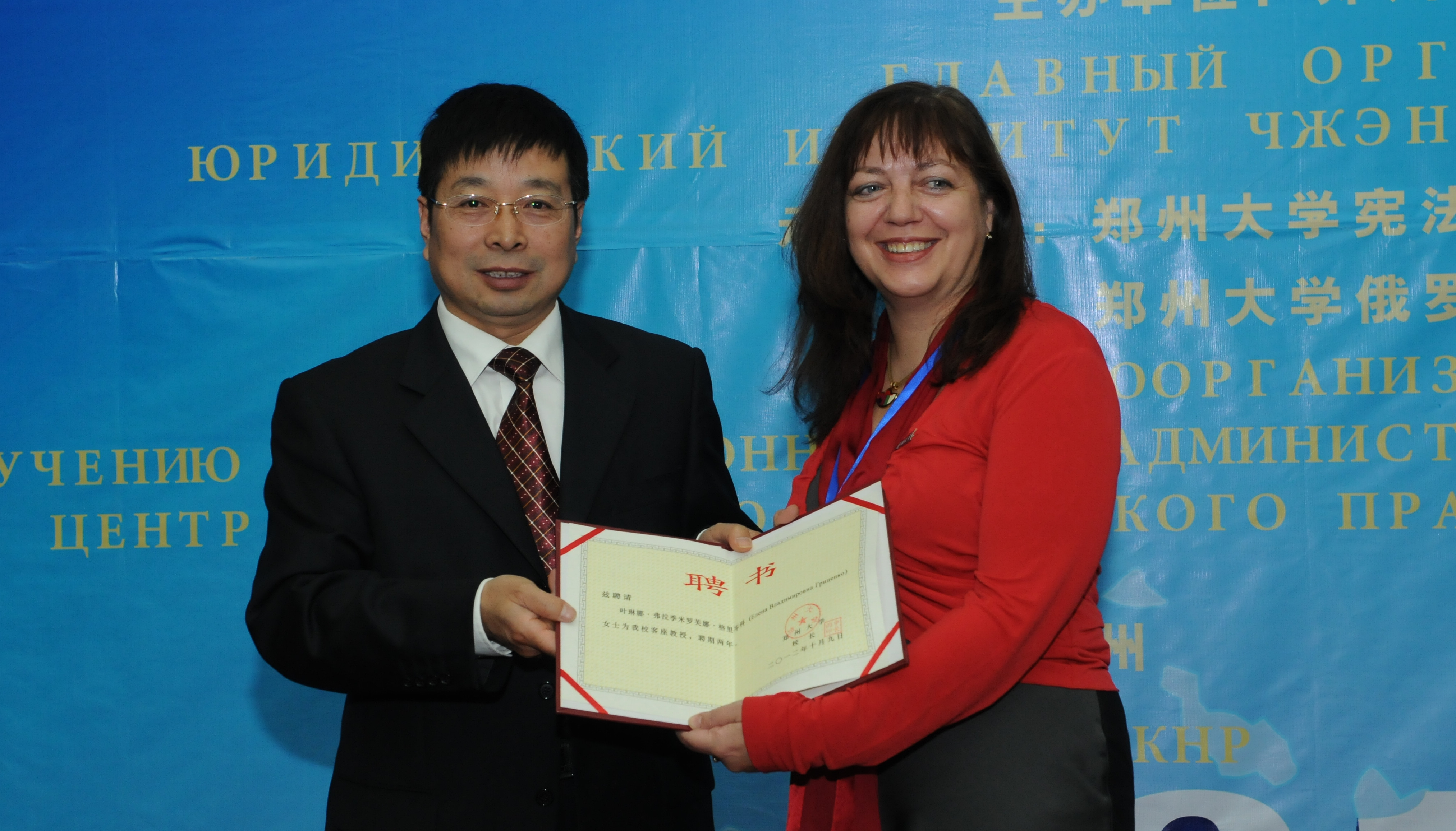 常俊标副校长在会上致辞,并为俄罗斯联邦功勋法学家В•А•捷廖欣教授,А•В•马利科教授,В•Н•安德里亚诺夫教授,С•Ю•莫罗佐夫教授,Е•В•格里岑科教授等五位专家颁发了pp电子官方网站客座教授证书并佩戴了校徽。俄罗斯高校代表向法学院刘向文教授颁发了俄罗斯期刊和年鉴编委专家聘书。