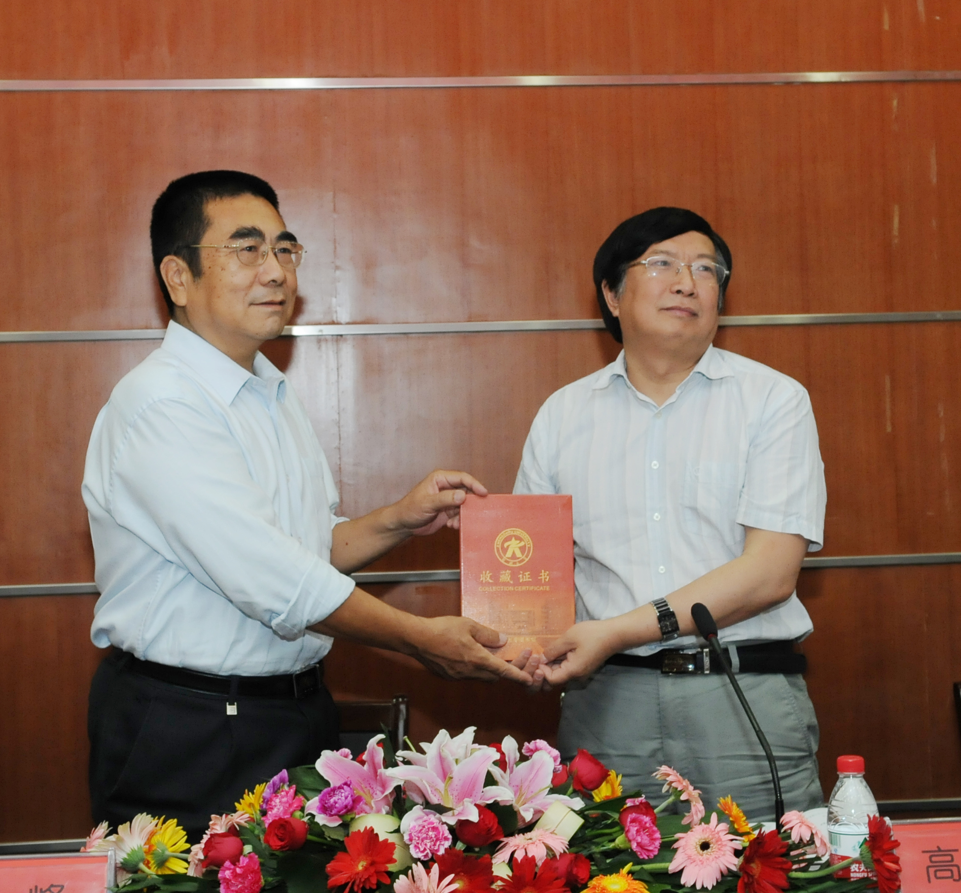 高治军先生将他已出版的7本诗集,每种各20本捐赠给了pp电子图书馆,并将《诗颂中原》一书赠给参会同学。党委常务副书记陈一峰为高治军先生颁发了捐赠证书。