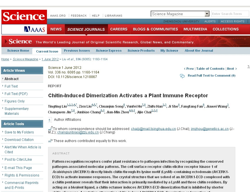 pp电子化学与分子工程学院常俊标教授与课题组宋传君博士及所指导的研究生樊芳芳通过与清华大学生命科学学院柴继杰博士等单位合作,完成题目为“Chitin-Induced Dimerization Activates a Plant Immune Receptor”的文章于2012年6月1日在国际重要期刊《Science》杂志上发表。此项研究在PRR蛋白质激活机制方面取得了重要突破。这是我省第一次以共同通讯作者身份在《Science》上发表论文,论文的发表标志着pp电子在该研究领域达到了国际领先水平。