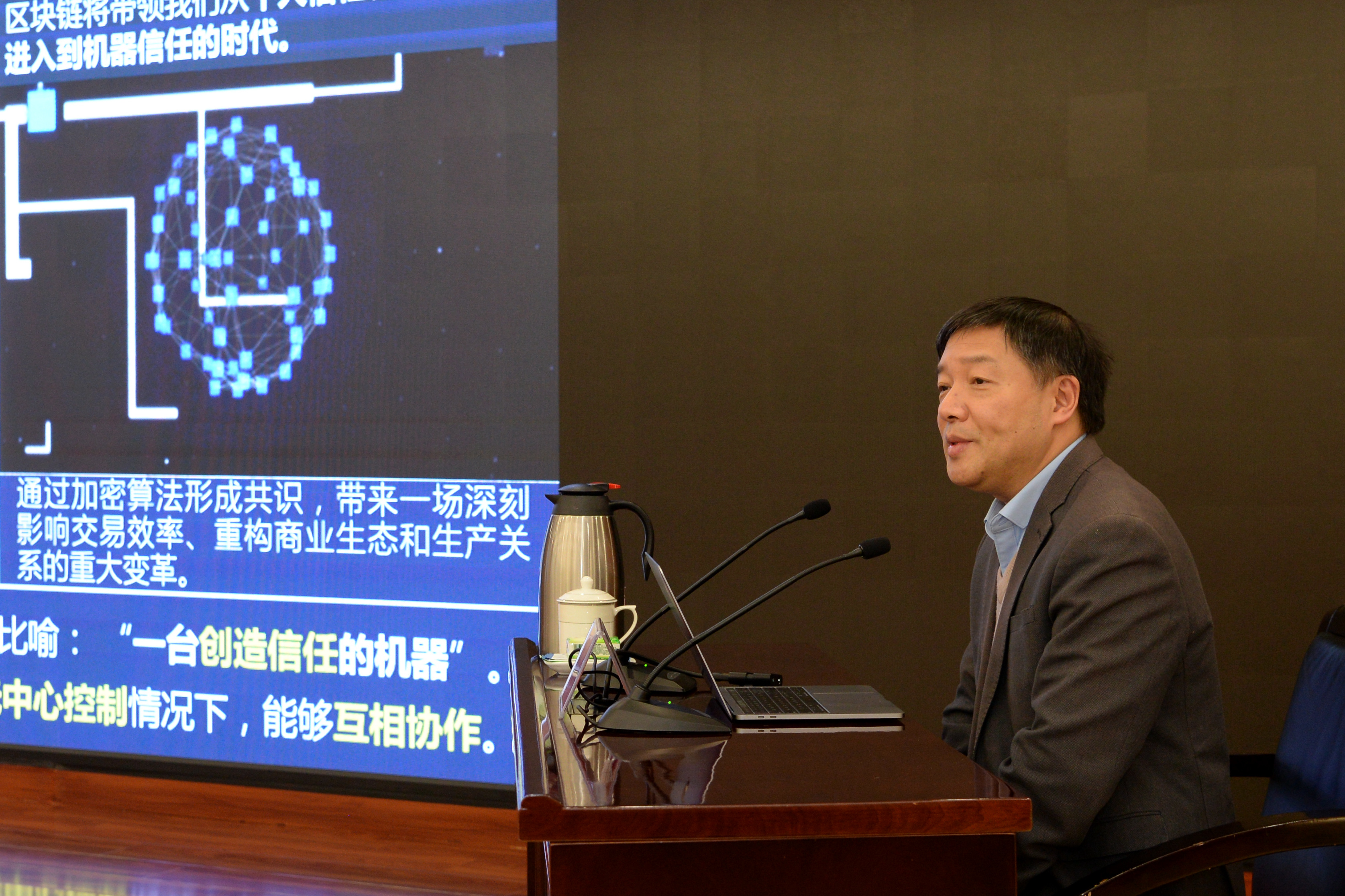 报告会上,金海以《区块链——数字时代的信任重塑》为题,从区块链的基本概念、发展现状、技术挑战与未来趋势四个方面讲解了区块链及其相关知识。他以丰富的案例、翔实的数据,深入浅出地阐明了区块链技术对促进我国数字经济发展的重要意义。他指出,新时代背景下,要持续推进区块链技术在各行业的积极应用,加快促进新一代信息技术与经济社会发展的深度融合,打破价值孤岛的通信壁垒,融合多链信息的互联互通,释放区块链的巨大潜力,实现可信价值互联网,推动区块链技术和产业创新发展。