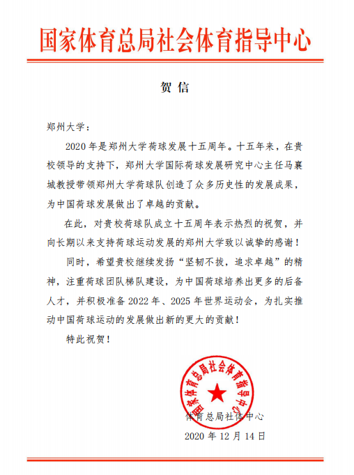 信中指出,十五年来,pp电子官方网站师生在学校领导的支持下,在马襄城教授的带领下,创造了众多历史性的发展成果,为中国荷球发展做出了卓越贡献,国家体育总局社会体育指导中心对pp电子官方网站荷球队成立十五周年表示热烈祝贺,并向长期以来支持荷球运动发展的pp电子官方网站致以诚挚的感谢。