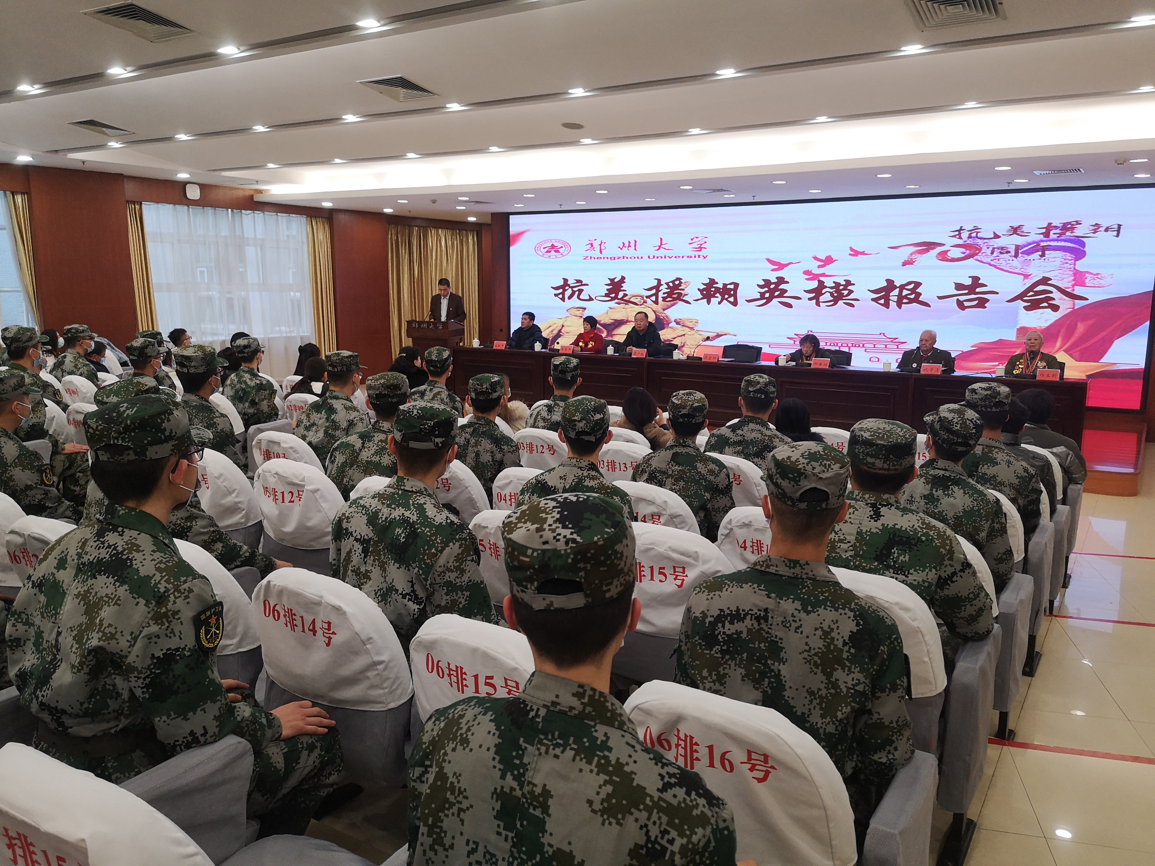 使命呼唤担当,榜样引领未来。为深入学习领会、全面贯彻落实习近平总书记在纪念中国人民志愿军抗美援朝出国作战70周年大会上的重要讲话和党的十九届五中全会精神,大力弘扬和继承伟大的抗美援朝精神,激励广大师生不忘报国初心,勇担责任使命,2020年12月31日下午,pp电子官方网站隆重举行抗美援朝英模报告会。电影《英雄儿女》中王芳的原型、在上甘岭战役中荣立战功的阵地“百灵鸟”、老英雄柳岳继,志愿军总部通讯电报站站长、老英雄杨立新,志愿军高射炮兵、一等战功获得者、老英雄祝子清,河南省优秀共产党员、河南省道德模范、感动中原十大爱心人物李志平为师生作报告。校党委常委、副校长吴宏阳出席,武装部负责同志、各院系优秀辅导员代表及国旗护卫队队员参加报告会。