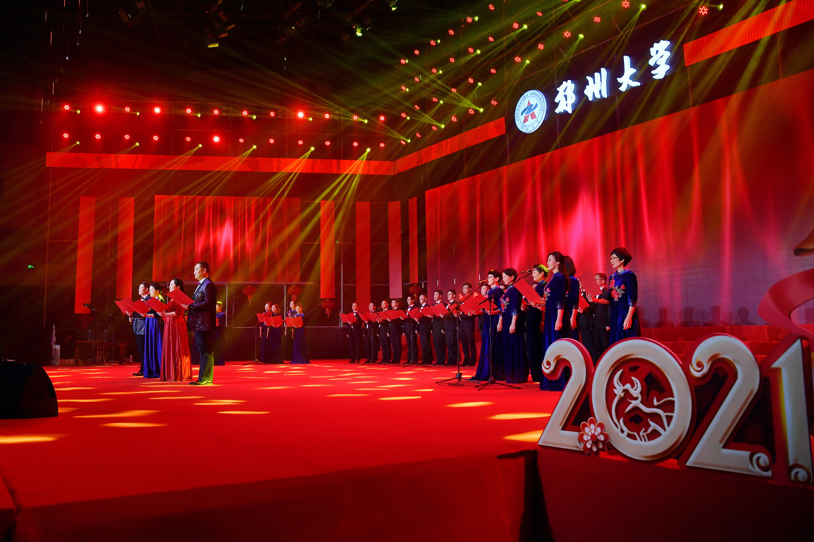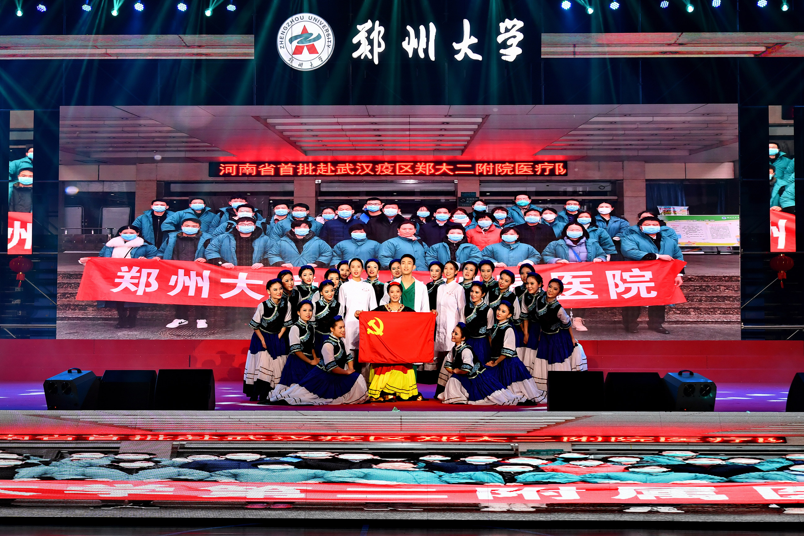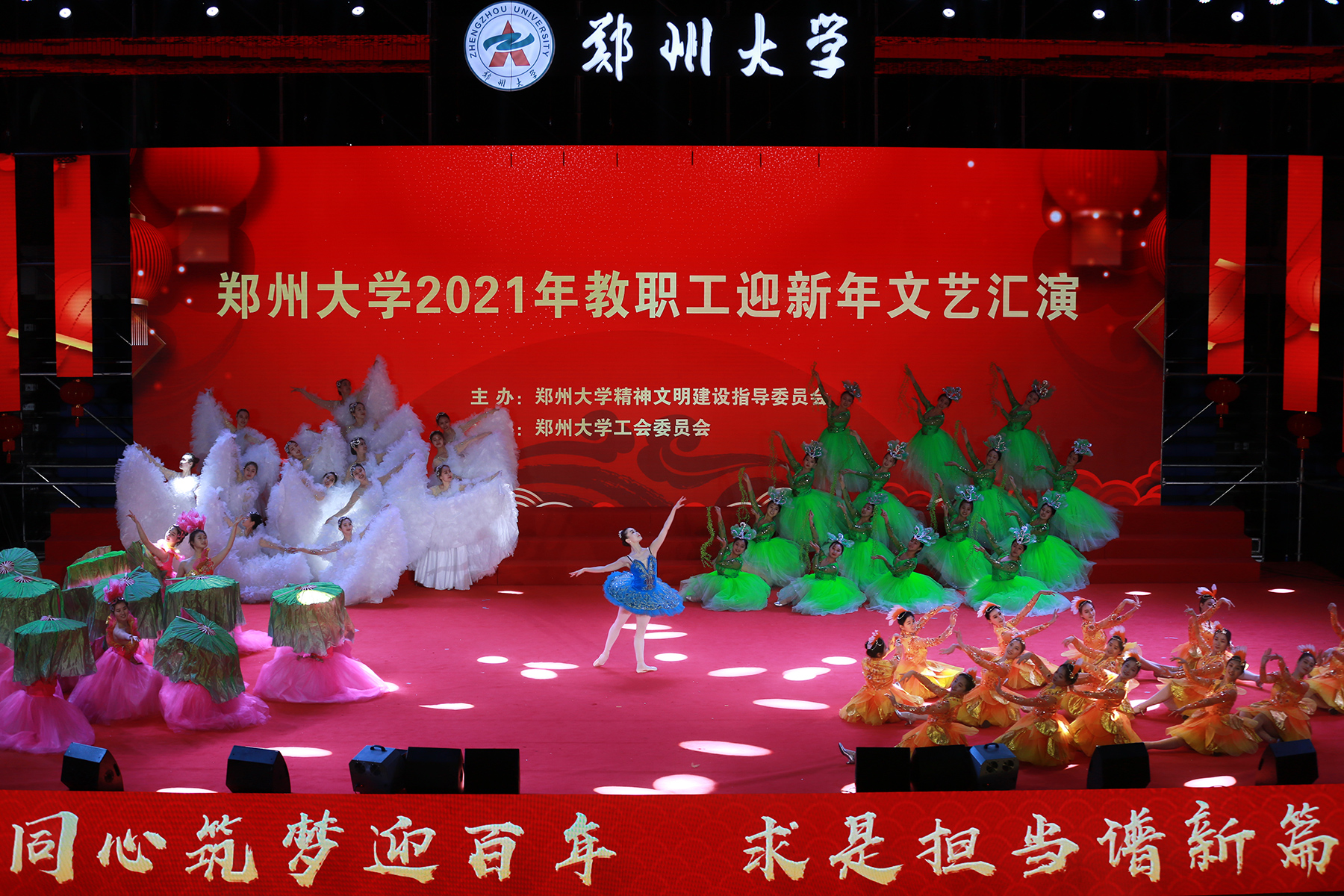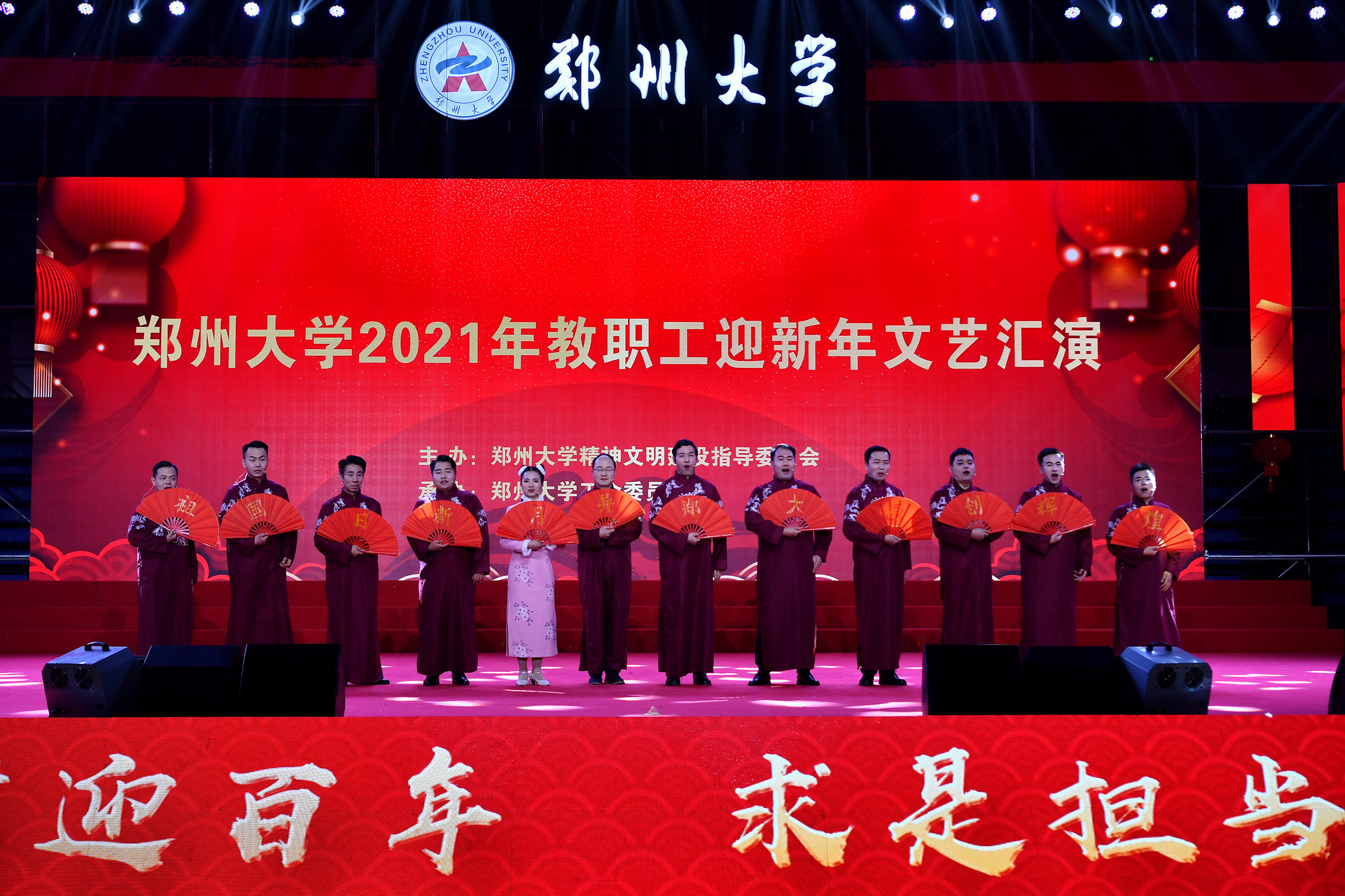 2020年12月31日,由学校精神文明建设指导委员会主办、工会委员会承办的2021年pp电子官方网站教职工庆元旦迎新年文艺汇演在主校区中心体育馆举行。音乐学院舞蹈《四季》拉开晚会序幕,美轮美奂的舞姿演绎出郑大的春夏秋冬;第一附属医院的舞蹈情景剧《生死不离》,生动再现了战疫期间“最美逆行者”为全国人民托起生命方舟的感人故事,现场观众无不感动落泪;国际教育学院带来朗诵《等你归来》,来自世界各地的留学生与郑大师生共克时艰,谱写出一曲人类命运共同体的生动赞歌;第二附属医院的舞蹈《守护》震撼人心,展现了中华民族亿万儿女守望相助、同心战疫的磅礴力量;河南豫剧院副院长贾文龙演唱的著名豫剧片段《吃亏歌》真挚朴实,唱出了广大党员干部人民至上的初心本色;第五附属医院的古典团扇舞《彩云追月》,为嫦娥五号揽月归来喝彩,点燃了为中国航空作出贡献、服务黄河国家战略的郑大人矢志报国、逐梦太空的科研理想;附属中学教师带来一场《盛世京韵》旗袍秀,将国风国韵之美展现得淋漓尽致,以美立德、以美育人;材料科学与工程学院歌伴舞《风光二十年》,讴歌了学校合校20年来的巨大变迁,展现了郑大人拼搏奋进的精神风貌;机关党委职工代表朗诵了由校党委常委、纪委书记许东升创作的诗歌《我是光荣的郑大人》,一流建设的出彩答卷、“求是 担当”的铮铮誓言,自豪与荣光在每一个郑大人心中升腾;药学院和人民武装部激情演绎情景表演《英雄赞歌》,三位抗美援朝老兵登上舞台,激励全校师生学习伟大抗美援朝精神,锤炼意志、勇毅前行;新闻与传播学院集体朗诵《百年礼赞》,带领全校师生重温一个个激荡人心的历史时刻,回望中国共产党波澜壮阔的百年征程,深情献礼建党100周年;图书馆带来舞蹈《中国红》,将火红的灯笼挂满舞台,这一抹红深沉而热烈,表达了郑大人对伟大祖国的深挚祝福;最后,伴随着欢快的歌伴舞《阳光路上》,文艺汇演圆满落幕。线上线下观众收获了满满的喜悦与感动,沉浸在跨年夜的浓厚氛围中。现将现场精彩节目图片奉上,敬请大家欣赏。(魏洪波 陈卓 孙未 刘文立 摄影)