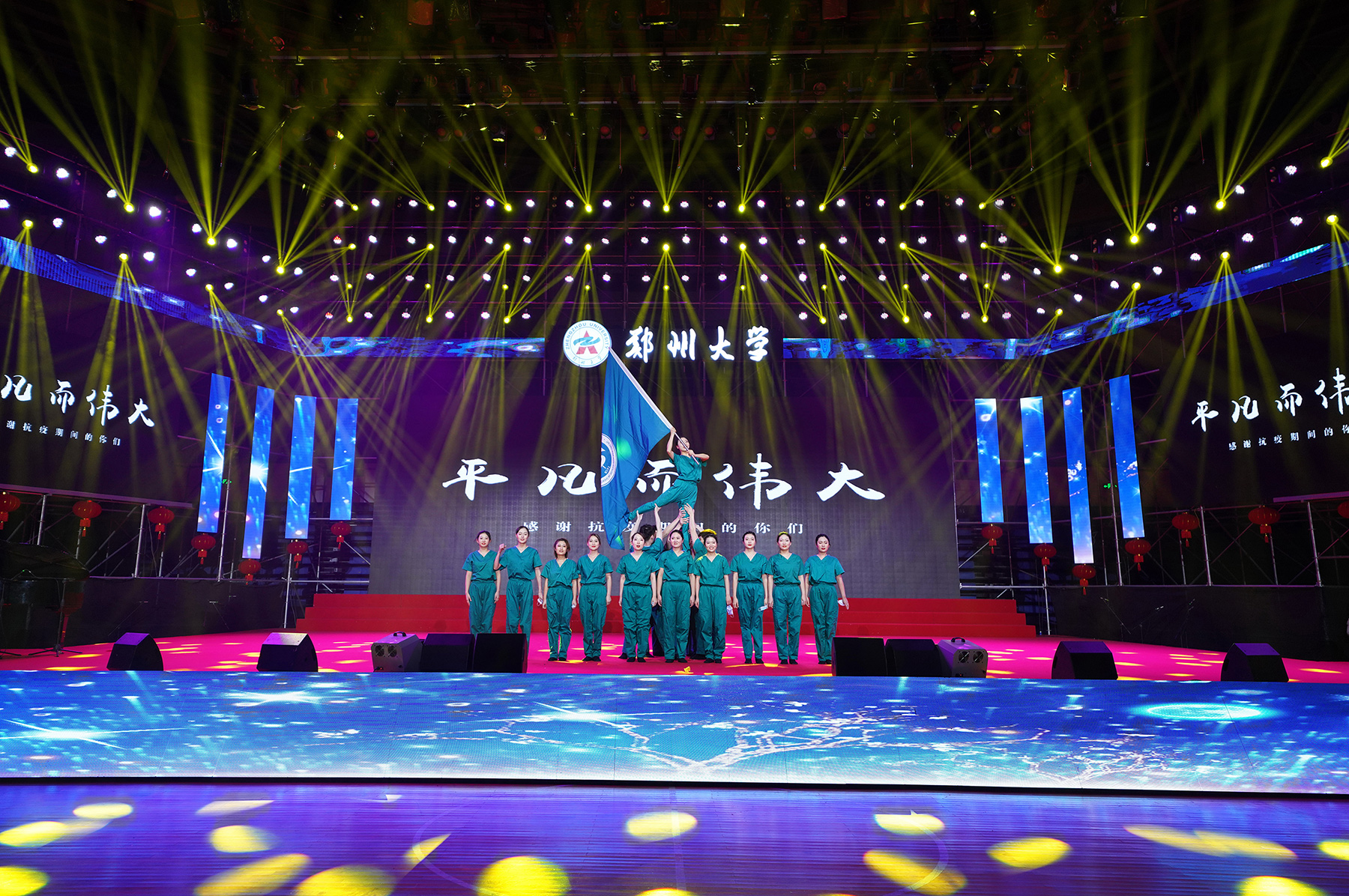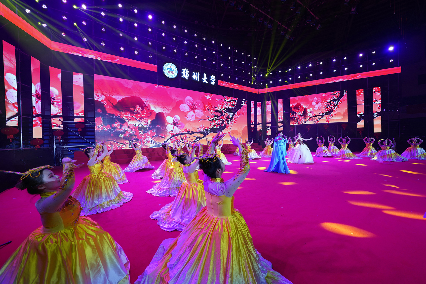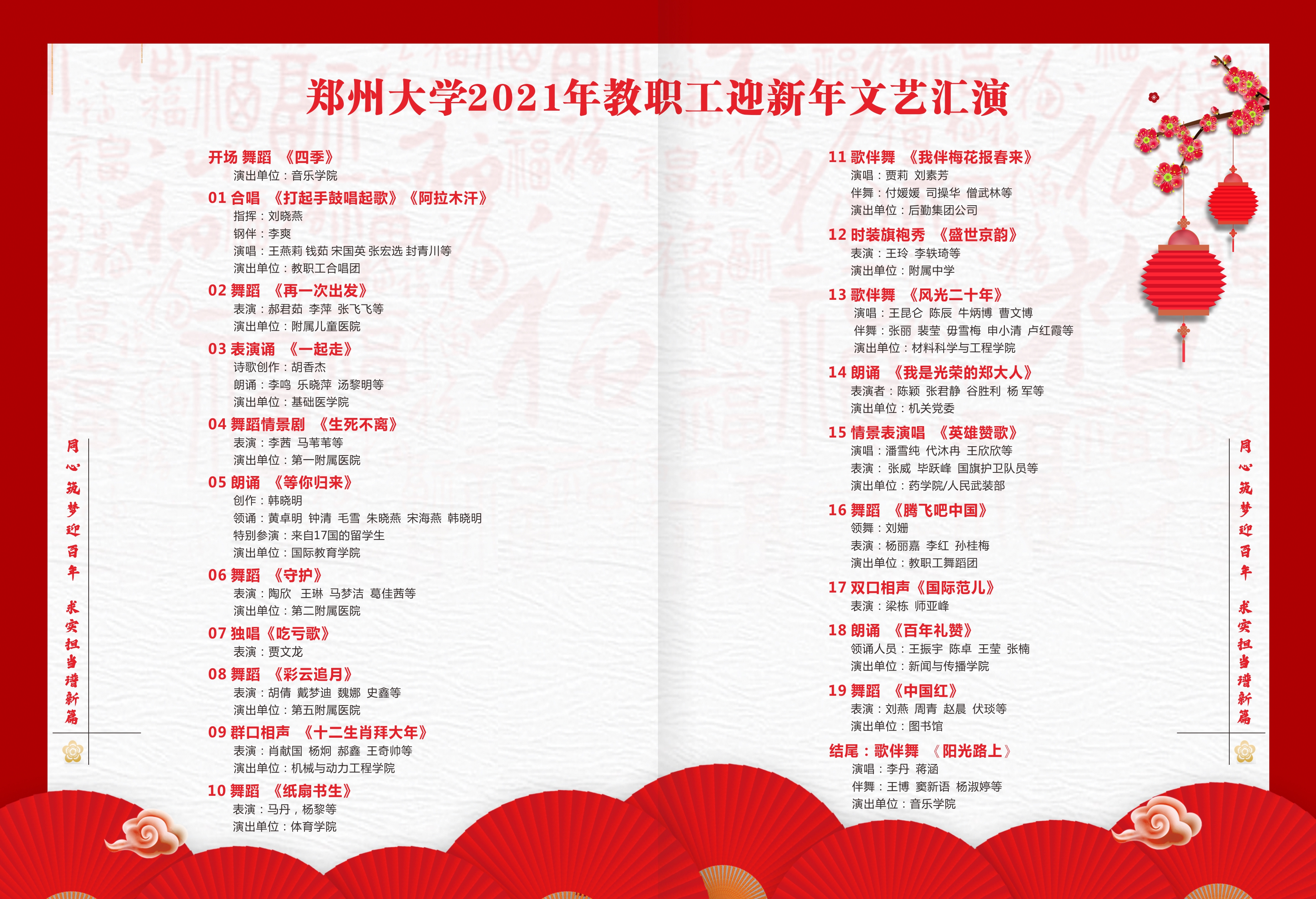 2020年12月31日,由学校精神文明建设指导委员会主办、工会委员会承办的2021年pp电子官方网站教职工庆元旦迎新年文艺汇演在主校区中心体育馆举行。音乐学院舞蹈《四季》拉开晚会序幕,美轮美奂的舞姿演绎出郑大的春夏秋冬;第一附属医院的舞蹈情景剧《生死不离》,生动再现了战疫期间“最美逆行者”为全国人民托起生命方舟的感人故事,现场观众无不感动落泪;国际教育学院带来朗诵《等你归来》,来自世界各地的留学生与郑大师生共克时艰,谱写出一曲人类命运共同体的生动赞歌;第二附属医院的舞蹈《守护》震撼人心,展现了中华民族亿万儿女守望相助、同心战疫的磅礴力量;河南豫剧院副院长贾文龙演唱的著名豫剧片段《吃亏歌》真挚朴实,唱出了广大党员干部人民至上的初心本色;第五附属医院的古典团扇舞《彩云追月》,为嫦娥五号揽月归来喝彩,点燃了为中国航空作出贡献、服务黄河国家战略的郑大人矢志报国、逐梦太空的科研理想;附属中学教师带来一场《盛世京韵》旗袍秀,将国风国韵之美展现得淋漓尽致,以美立德、以美育人;材料科学与工程学院歌伴舞《风光二十年》,讴歌了学校合校20年来的巨大变迁,展现了郑大人拼搏奋进的精神风貌;机关党委职工代表朗诵了由校党委常委、纪委书记许东升创作的诗歌《我是光荣的郑大人》,一流建设的出彩答卷、“求是 担当”的铮铮誓言,自豪与荣光在每一个郑大人心中升腾;药学院和人民武装部激情演绎情景表演《英雄赞歌》,三位抗美援朝老兵登上舞台,激励全校师生学习伟大抗美援朝精神,锤炼意志、勇毅前行;新闻与传播学院集体朗诵《百年礼赞》,带领全校师生重温一个个激荡人心的历史时刻,回望中国共产党波澜壮阔的百年征程,深情献礼建党100周年;图书馆带来舞蹈《中国红》,将火红的灯笼挂满舞台,这一抹红深沉而热烈,表达了郑大人对伟大祖国的深挚祝福;最后,伴随着欢快的歌伴舞《阳光路上》,文艺汇演圆满落幕。线上线下观众收获了满满的喜悦与感动,沉浸在跨年夜的浓厚氛围中。现将现场精彩节目图片奉上,敬请大家欣赏。(魏洪波 陈卓 孙未 刘文立 摄影)