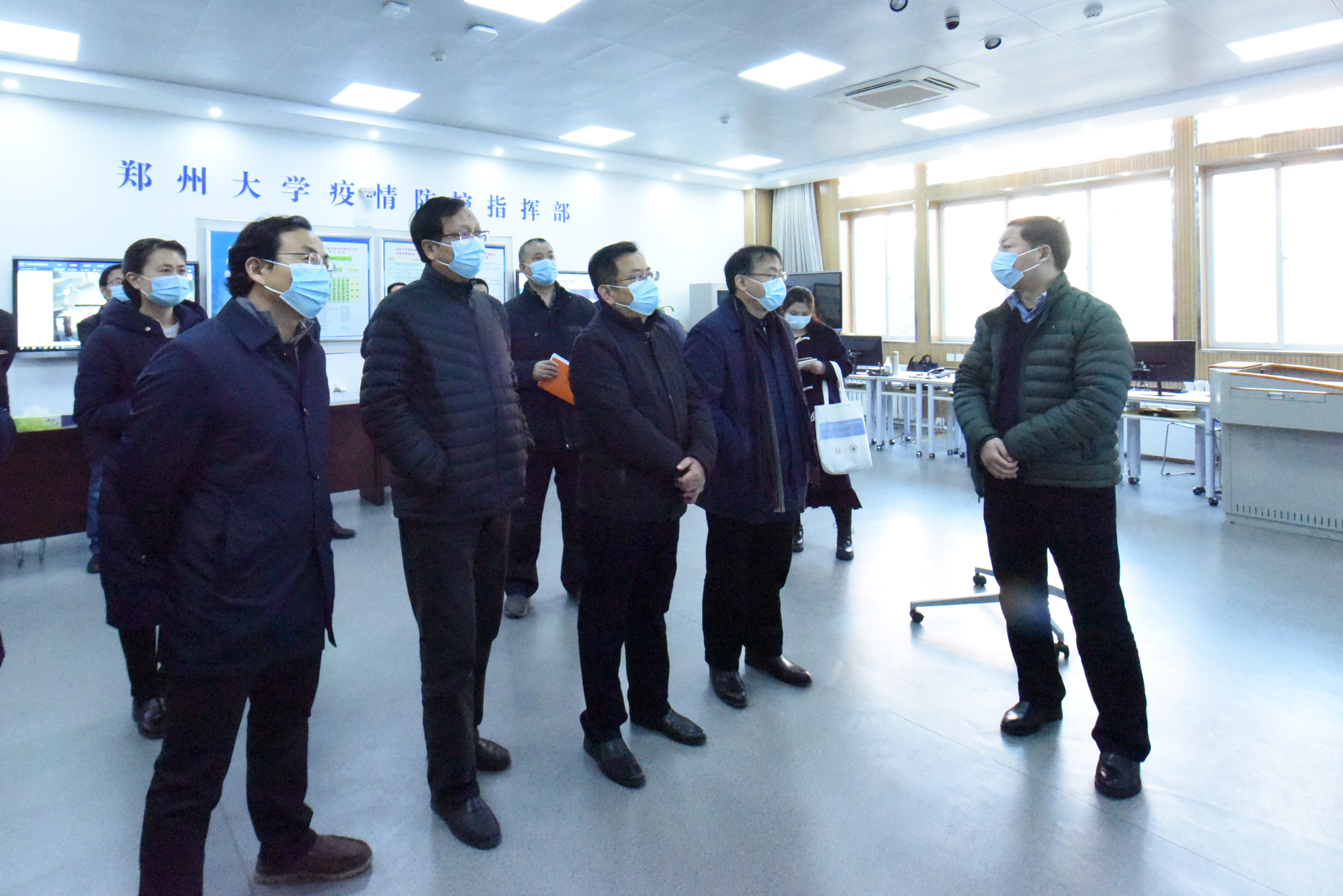 1月19日下午,由郑州市教育局副局长葛飞、高新区社会事业局副局长李国林一行组成的督导组来校调研督查疫情防控工作。校党委常委、副校长韩国河陪同调研,相关单位负责同志参加调研。