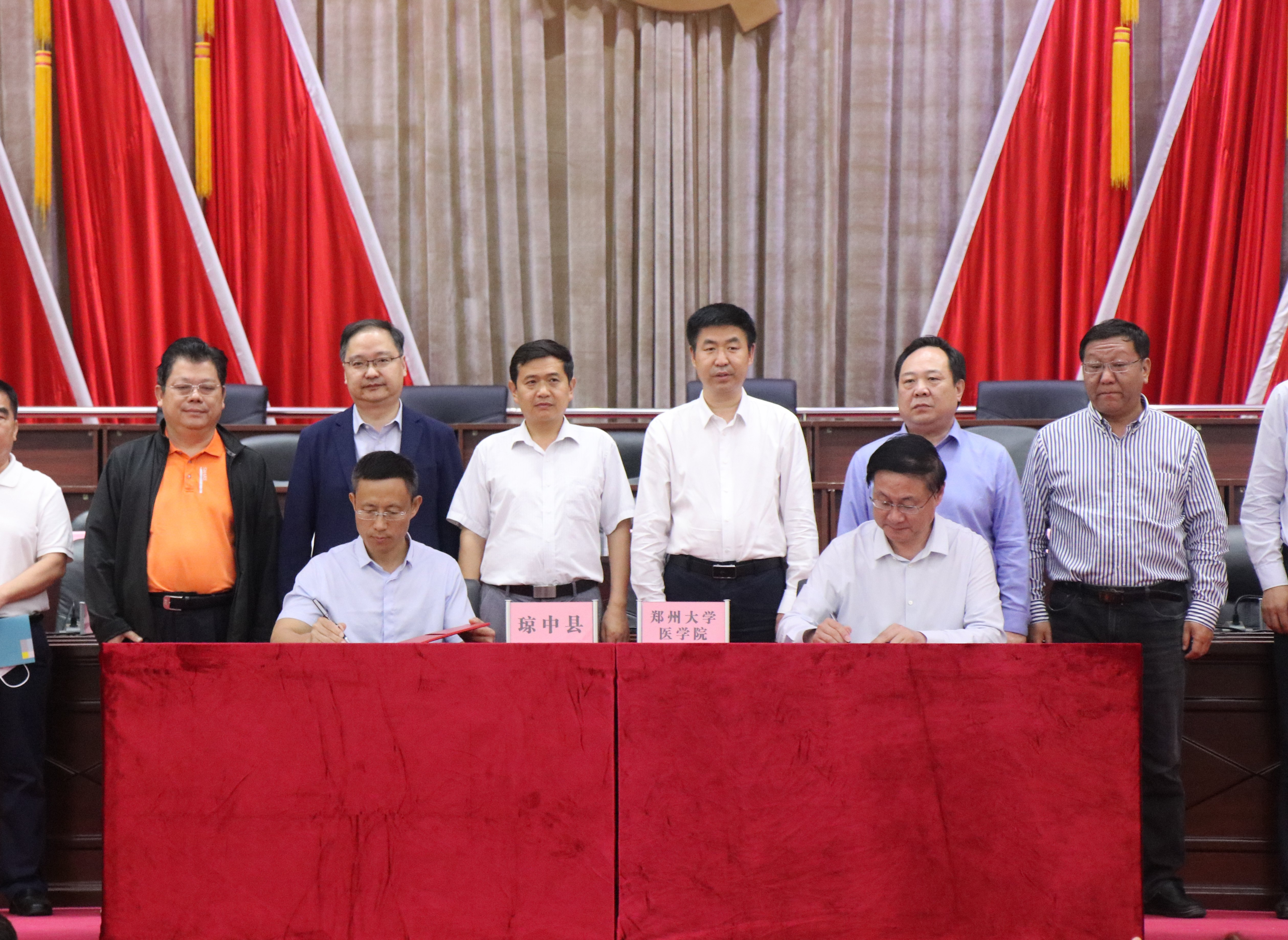 刘章锁和琼中县副县长陈海滨代表双方签署《海南省琼中黎族苗族自治县人民政府pp电子官方网站医学院托管协议》。宋争辉、徐斌共同为pp电子官方网站琼中医院揭牌。