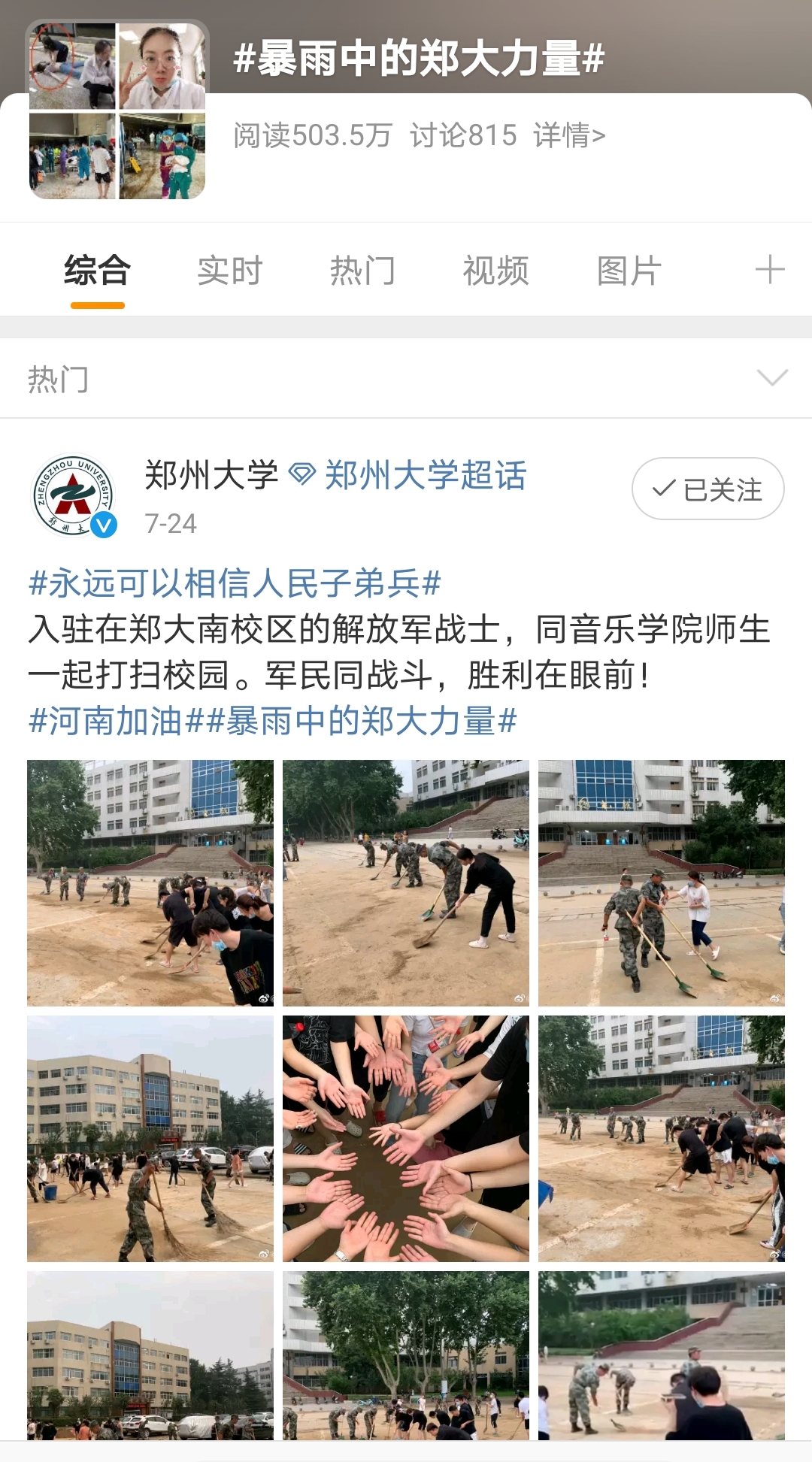 一方有难,八方支援,郑大师生的安危牵动着全国各地民众的心。pp电子官方网站官方微博话题#暴雨中的郑大力量#全网阅读量突破500万次,全国高校积极参与学校官方头条话题#多所高校暖心喊话河南学子#,为郑大送上暖心祝福;师生、校友、亲友等心系郑大,纷纷向河南省慈善总会、红十字会捐款捐物;陆军第83集团军“杨根思部队”900余名官兵入驻南校区,帮助防汛救灾、重建家园;科大讯飞、深圳昊博集团等爱心企业向学校捐赠防汛物资,为郑大师生、为河南人民送来温暖和帮助。灾难面前显真情,守望相助战汛情!
