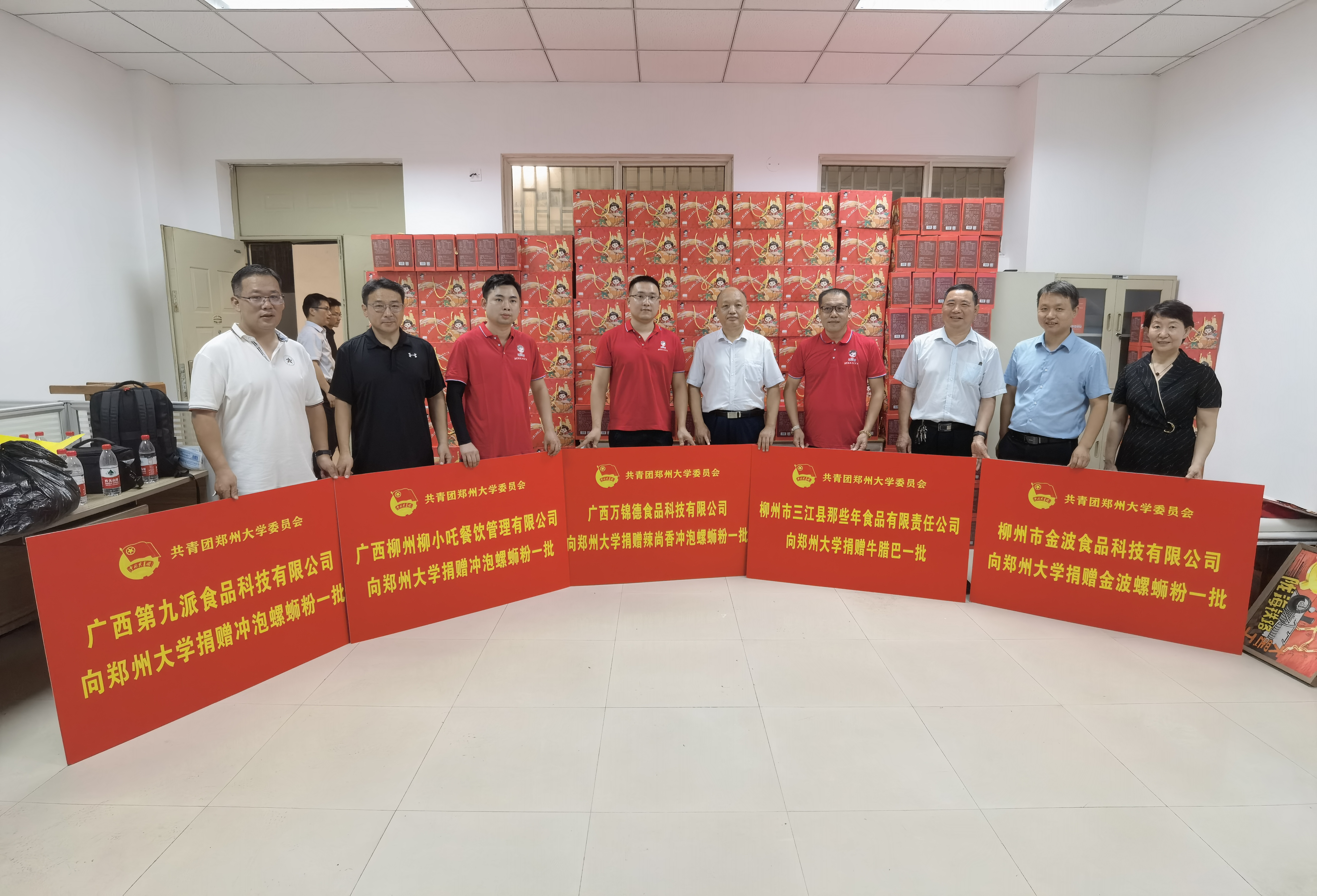 7月26日晚,广西万锦德食品科技有限公司总经理彭万里、副总经理梁启明,广西柳小吒餐饮管理有限公司总经理龙海等来校,捐赠防汛救灾物资。校党委常委、纪委书记许东升及党委组织部、校纪委、校团委、对外联络办公室等单位负责同志共同接受了捐赠。除以上企业外,广西第九派食品科技有限公司、柳州市三江县那些年食品有限责任公司、柳州市金波食品科技有限公司等五家企业共捐赠螺蛳粉等食品一万七千余份。