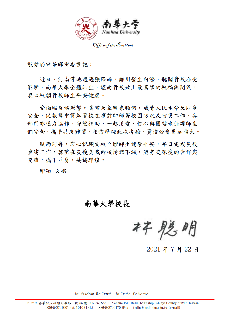 南华大学林聪明校长表示:“从报导中得知贵校在事前即部署校园防汛及防灾工作,各部门亦通力协作,守望相助,一起用爱、信心与团结来保护师生们安全,携手共度难关,相信历经此次考验,贵校必会更加强大”。