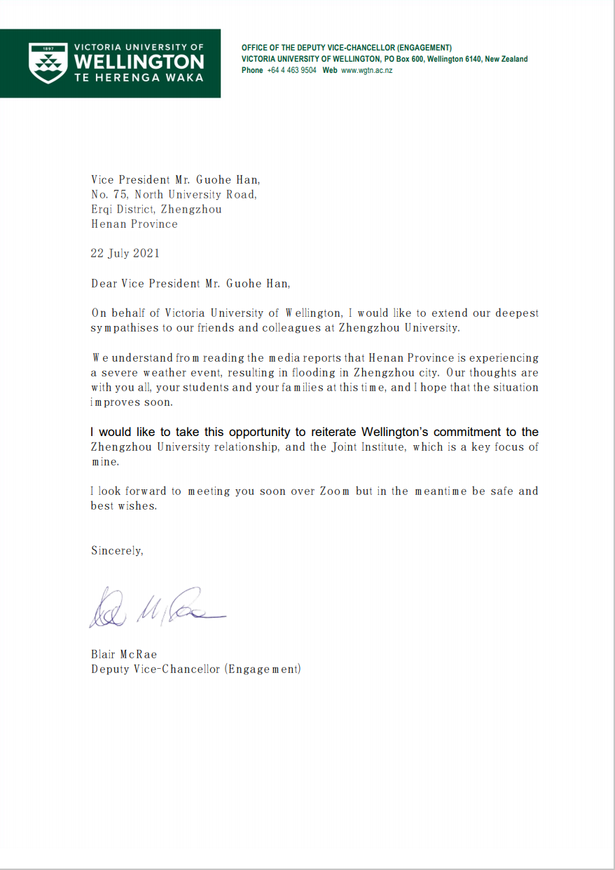 新西兰惠灵顿维多利亚大学布莱尔麦克雷副校长慰问信中表示:“河南省正在经历一场严重的自然灾害,导致郑州市洪水泛滥。此时,我们与贵校师生以及他们的家人,希望情况灾情能够迅速好转,继续我们两校之间联合学院的申请,增进两校合作关系”。