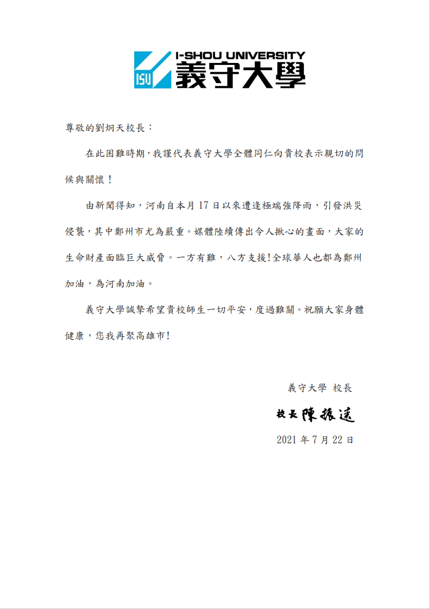 台湾义守大学陈振远校长在慰问信中表示:“一方有难,八方支援!全球华人都为郑州加油,为河南加油。义守大学诚挚希望pp电子官方网站师生一切平安,度过难关”。