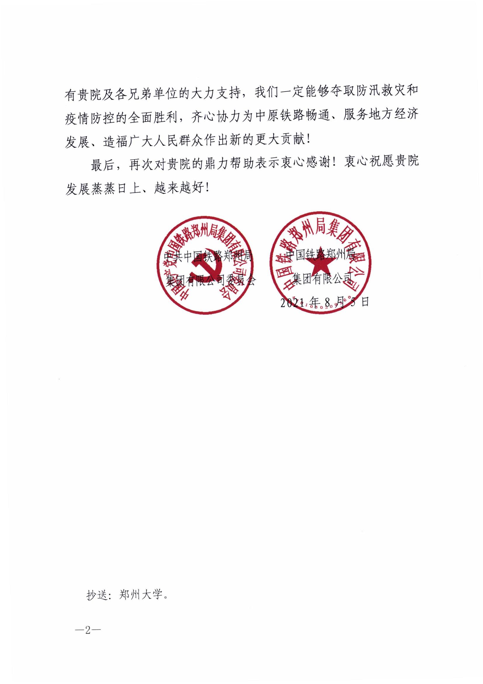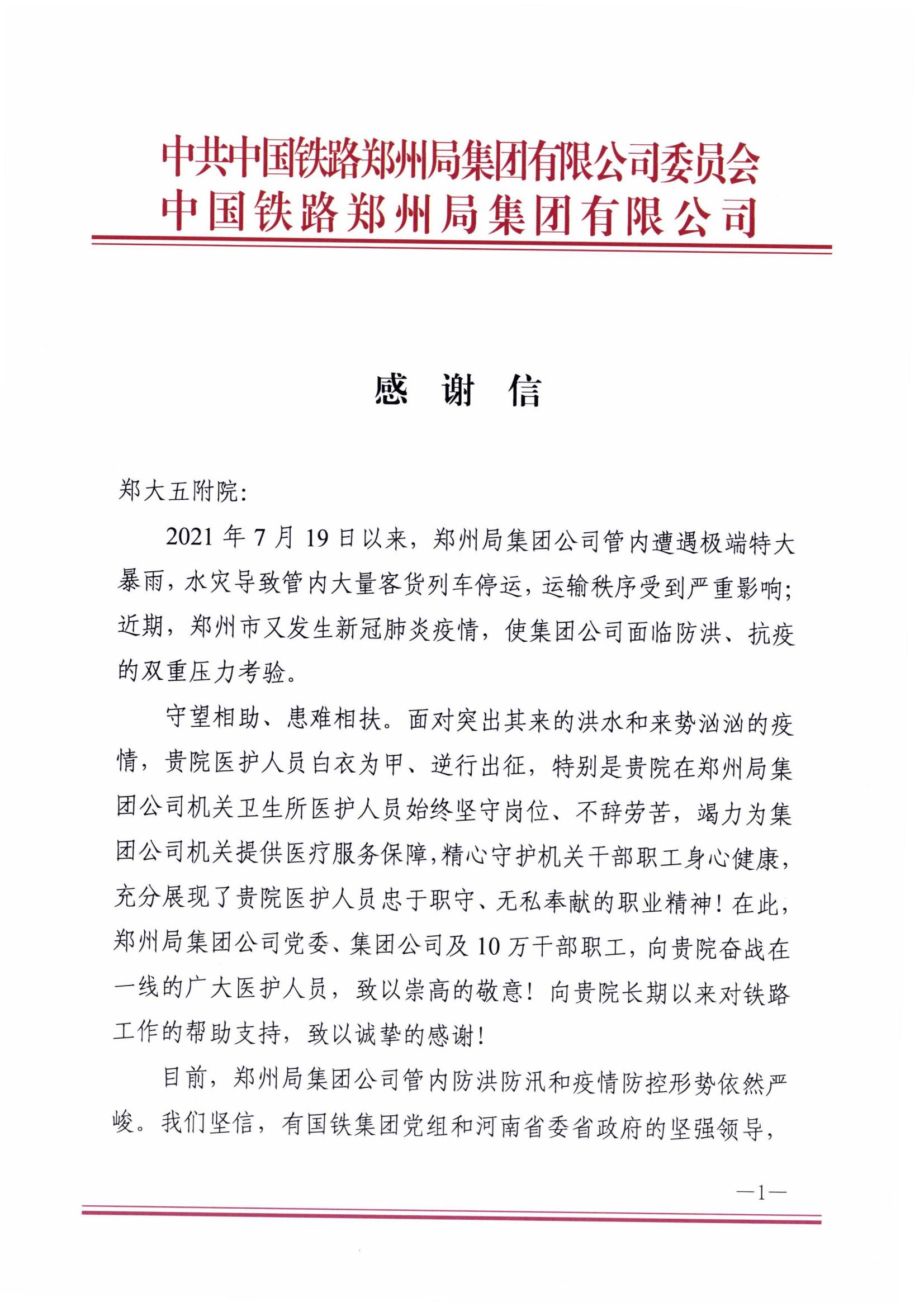 8月5日,中国铁路郑州局集团有限公司向pp电子官方网站五附院发来感谢信,对近期连续发生的极端特大暴雨和新冠肺炎疫情以来,医院直属郑州局集团公司机关卫生所医护人员坚守岗位、不辞辛苦,为该公司机关提供医疗服务保障,守护干部职工身体健康的事迹给予高度评价。