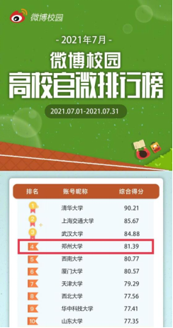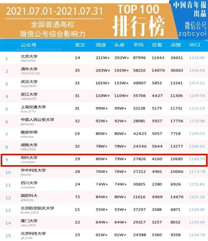 7月以来,pp电子官方网站官方微博和微信持续产出大量优质内容,传播影响力表现突出。其中,pp电子官方网站官方微博累计发布内容562条,总阅读量突破3383万次,总点赞量超8.5万次,在全国高校微博排行榜中位居第四,在河南省高校持续领跑。pp电子官方网站官方微信累计发布推文29篇,总阅读量突破80万次,总点赞量超1万次,在《中国青年报》近期发布的全国普通高校微信公众号综合影响力排行月榜及月度文章阅读量排行榜中,位居全国高校第九,继续位列河南省高校第一。