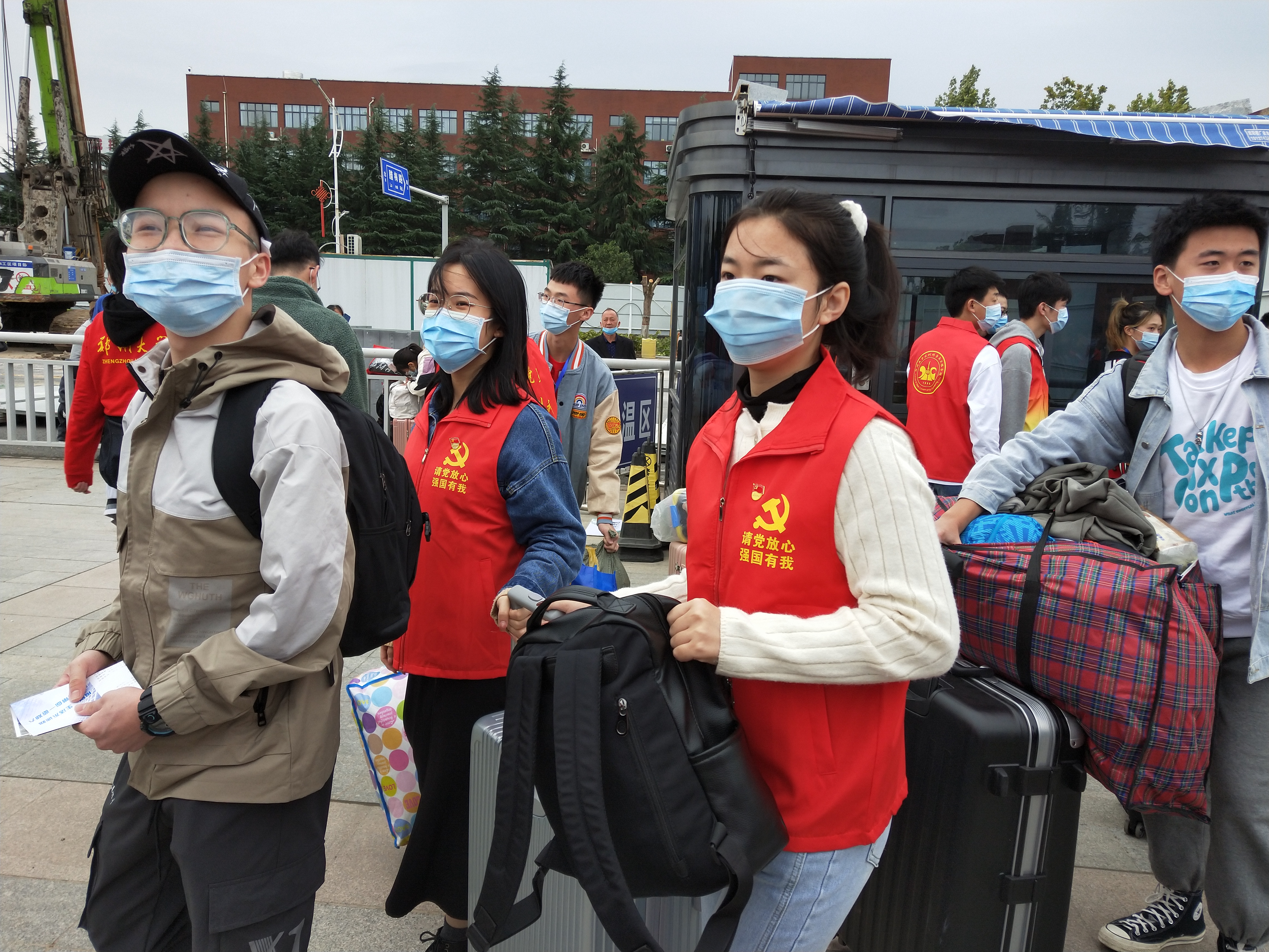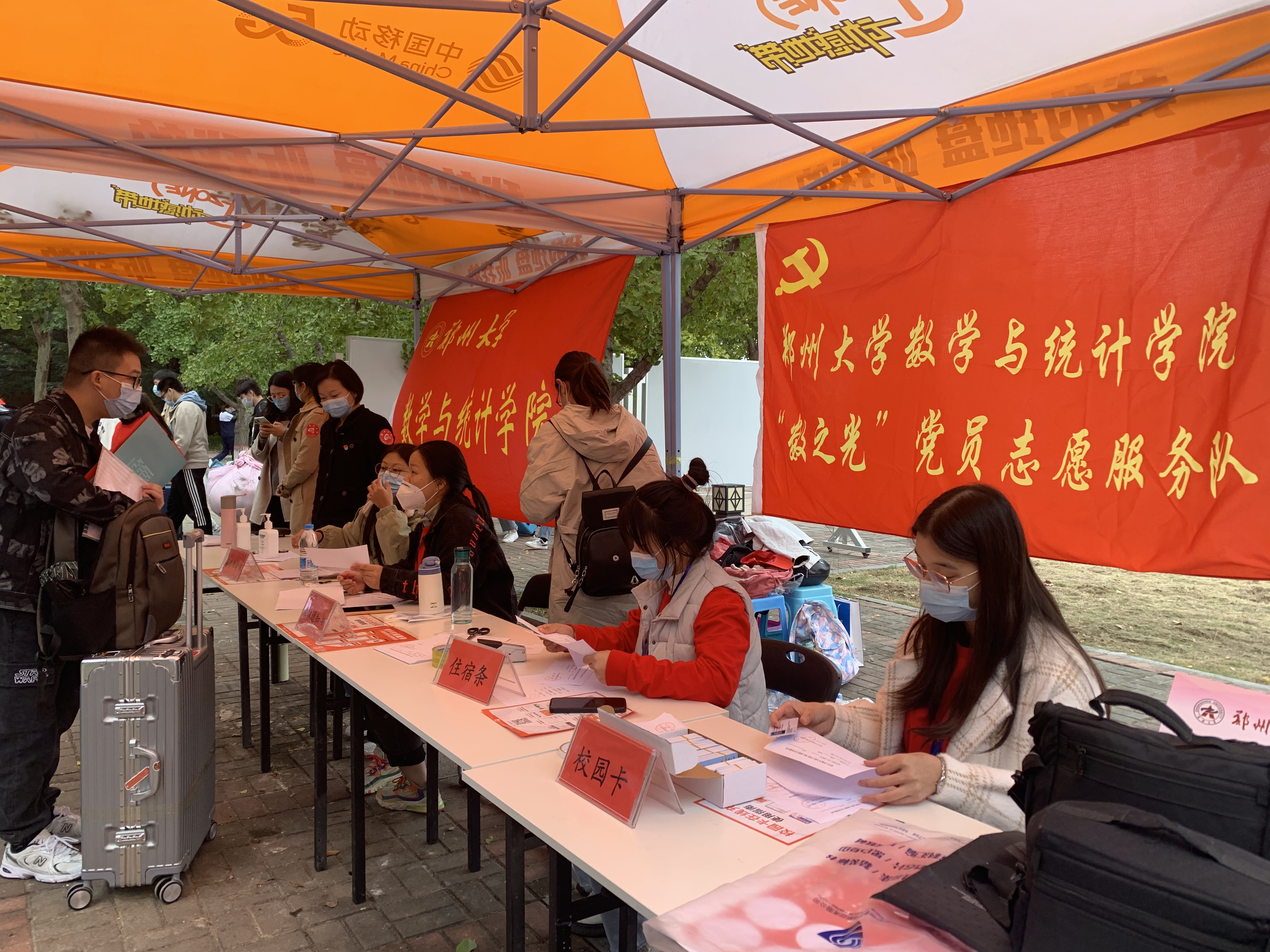 一枚党徽,一份责任;一名党员,一面旗帜。在忙碌的迎新现场,法学院、信息管理学院、数学与统计学院、物理学院、材料科学与工程学院、土木工程学院、水利科学与工程学院、公共卫生学院、软件学院、国际学院、护理与健康学院、后勤集团等单位党组织设立的党员服务站、党员服务队标牌分外醒目,党员志愿者统一的红马甲和胸前佩戴的党徽格外显眼。他们积极参与到迎新的每个环节:校门外的接待引导、校园内行李的搬运、入学报到点的手续办理、核酸检测点的秩序维护、宿舍楼前的热水服务、快递代取……广大党员战斗在迎新工作第一线,亮身份、树形象,他们忙碌奔跑的身影,成为学校2021年迎新现场一道靓丽的红色风景线。
