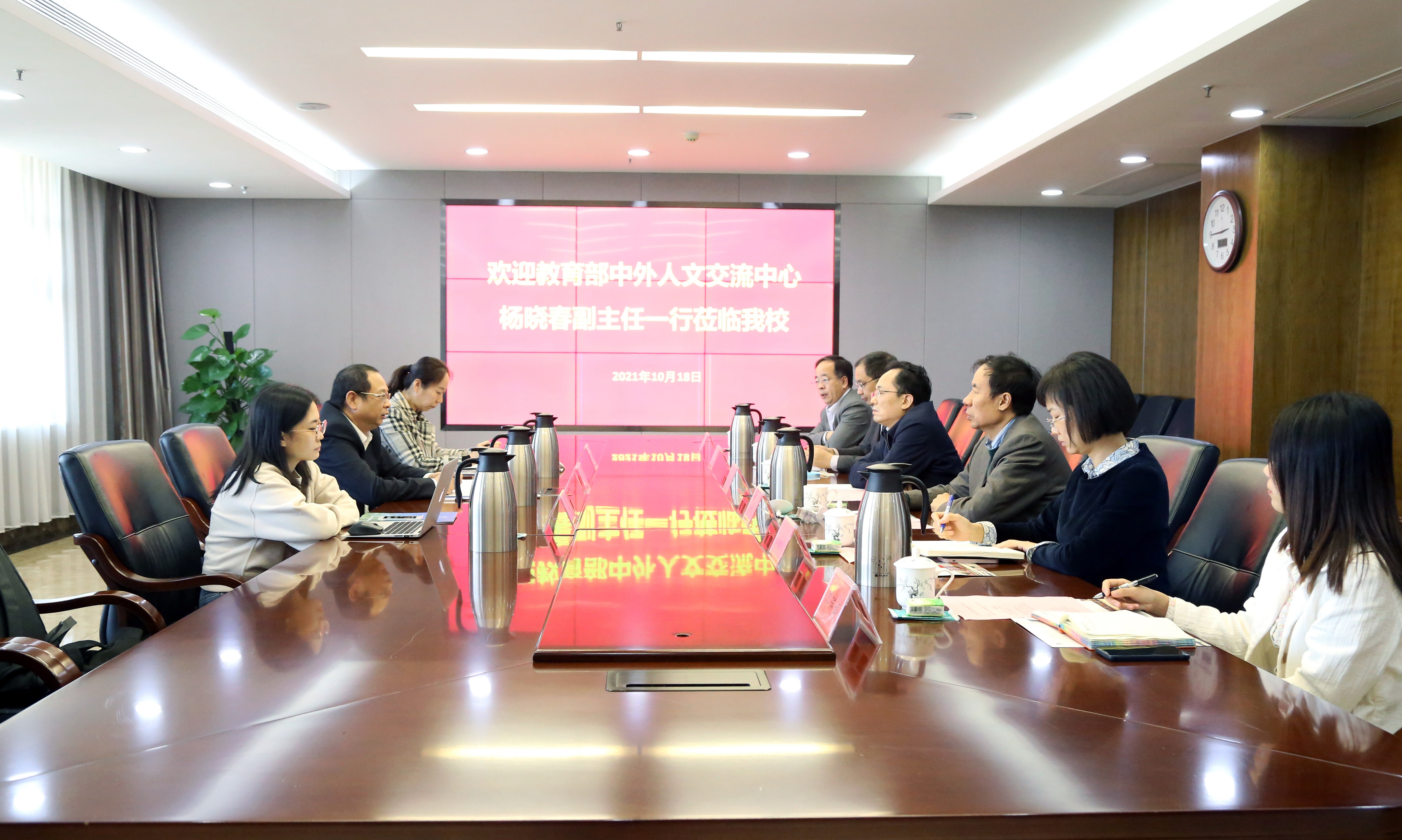 10月18日,教育部中外人文交流中心副主任杨晓春一行来校调研高层次国际化人才培养工作,校党委常委、副校长关绍康会见了来访客人,国际交流与合作处、外国语与国际关系学院负责同志参加会见。