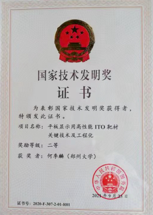 何季麟院士团队面向国家战略需要,聚焦战略新兴平板显示器用关键基础材料研究,创新发明了ITO靶材粉体制备、 素坯注浆成形、无压氧气氛烧结与靶坯绑定——关键技术体系,建立了ITO靶材制备新型工艺流程,形成了完善的全流程工艺装备体系及控制标准,实现了ITO靶材粉末冶金技术的创新应用,其技术指标达到了国际先进水平。该技术突破性解决了高性能ITO靶材制备全流程工序的关键技术与装备“卡脖子”问题,填补了国内空白。项目产品在国内首次成功应用于世界最大面板企业京东方的高世代TFT线,打破了国外技术壁垒,完全可以替代进口,推进了我国战略新兴显示产业用关键基材的国产化进程。在研发过程中,还建立了高水平靶材研发平台与团队,为行业培养了一批领军与骨干人才。这些都为靶材料“中国制造”到“中国创造”做出了示范引领性贡献。此前,该项目荣获2019年度中国有色金属工业科学技术一等奖。