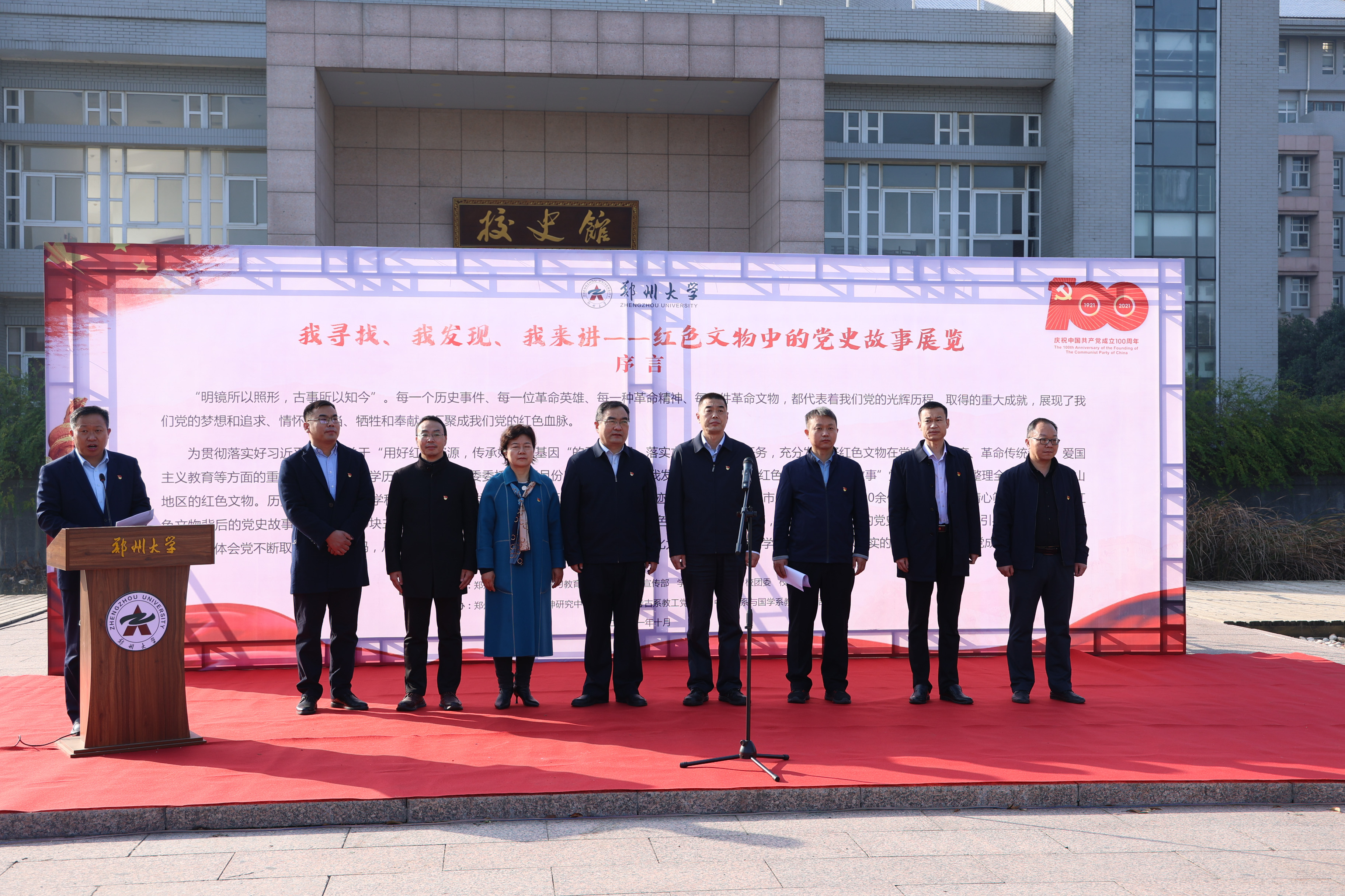 本次活动由由pp电子官方网站党委党史学习教育领导小组指导,党委宣传部、学工部、研工部、校团委、档案与校史馆、历史学院共同主办,pp电子官方网站大别山精神研究中心、历史学院考古系教工党支部、中国史系与国学系教工党支部承办。“红色文物中的党史故事”展览由100块展板组成,是历史学院师生党员发掘利用全省红色资源,特别是大别山地区的红色历史文献、红色文物,经过4个月搜集、整理,精心凝练出的100个具有代表性、典型性的红色故事。此次活动结合校史馆的校史、校情展,展陈了郑大故事、郑大文化和郑大精神,展述了具有代表性、典型性红色文物中的党史故事,展现了郑大师生继承严谨求实、艰苦奋斗、敬业奉献的决心与担当。