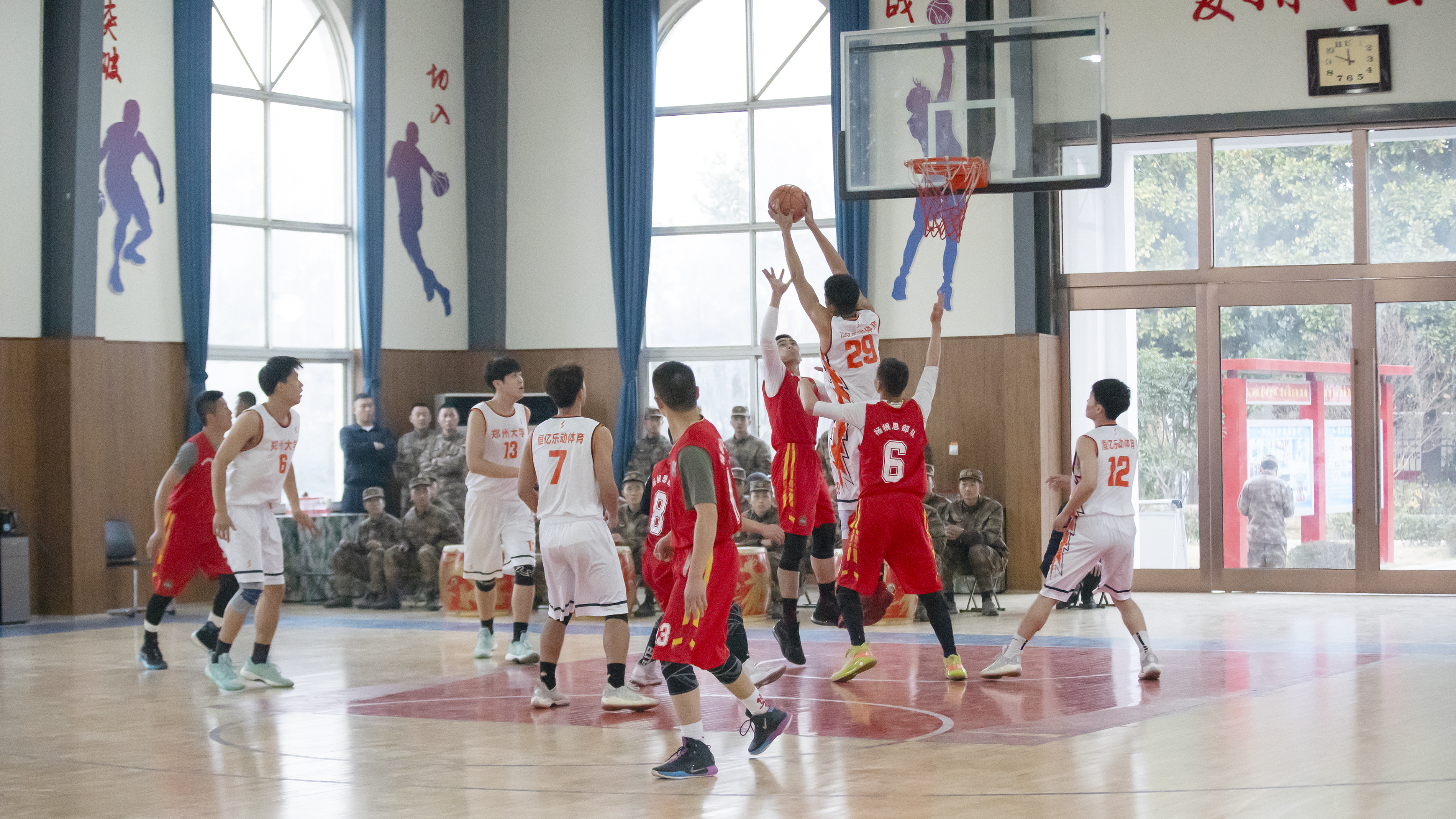 应部队邀请,双方在根思文体中心举行了一场篮球友谊赛,学校师生和部队官兵一同观战。队员在赛场上奋力拼搏,比赛精彩纷呈、高潮迭起。部队官兵不时为郑大篮球队员喝彩助威,现场气氛热烈。友谊赛加强了校队交流,增进了军民友谊,同时也丰富了部队官兵的文体生活,培养了青年学生的集体荣誉感。