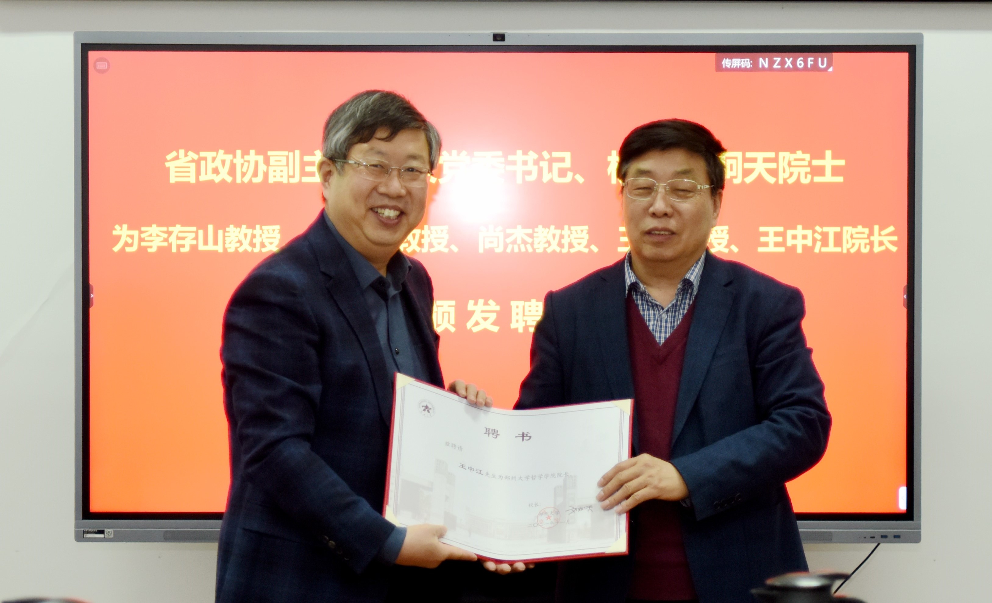 省政协副主席、校党委书记、校长刘炯天向教育部“长江学者”特聘教授王中江颁发哲学学院(老子学院)院长聘任证书