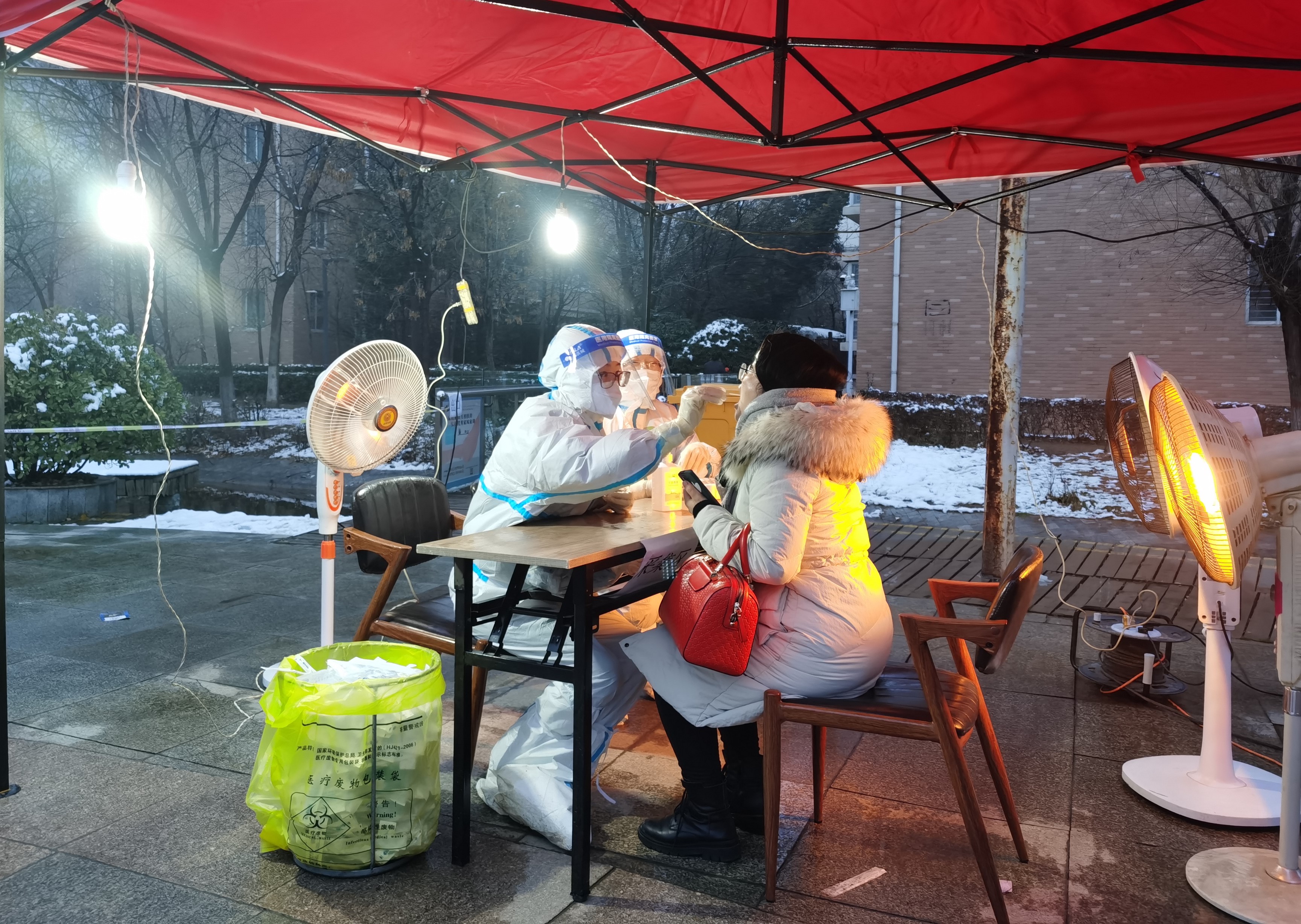 无论是深夜还是凌晨,每次一接到采样任务,三附院都立即行动,组织抽调人员,各科室积极响应、踊跃报名。采样队员到达采样点位后,医疗队与社区对接,了解工作量情况和人员分布,大家密切协作,立即投入到采样工作中。由于正值寒冬,加上雨雪天气,给医务人员的采样工作带来了困难。但是为了提高采样效率,减少居民的等候时间,大家冒着严寒、连续作战,常常顾不上休息和按时吃饭。