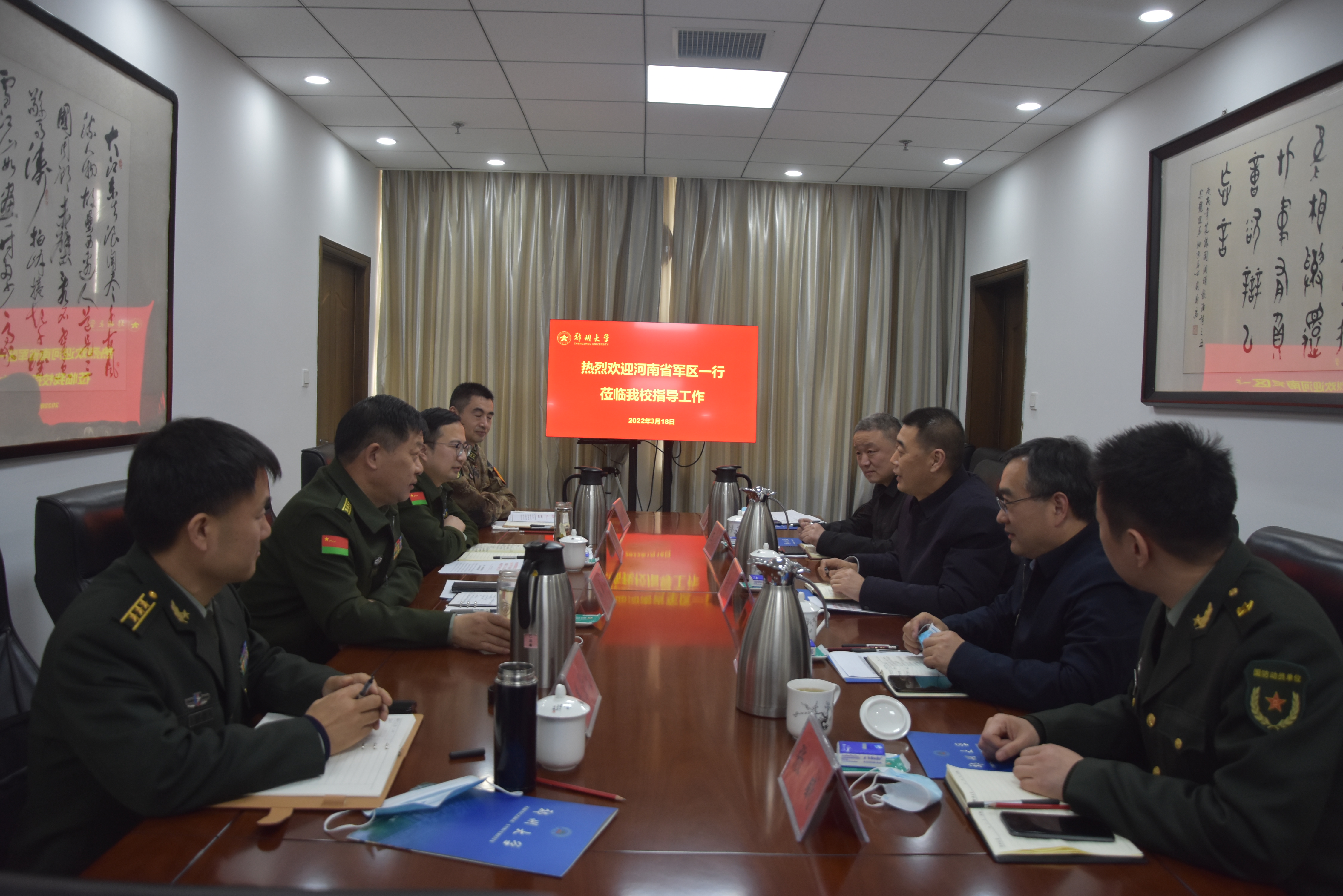 3月18日,河南省军区政治工作局副主任韩申国、政治工作局国教双拥组组长王莹、郑州警备区政治工作处主任焦景宏、中原区人民武装部部长施小武一行来校调研指导国防教育工作。校党委副书记吴宏阳出席会议,人民武装部相关同志参加会议。会议由人民武装部负责同志主持。