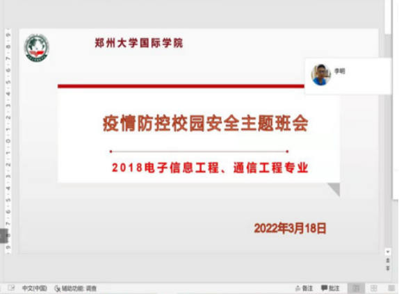 国际学院以线上线下相结合的方式召开疫情防控主题班会,带领同学们学习了河南省疫情防控指挥部办公室下发的各类防控指导文件,使大家认识到了当前疫情防控形势依旧严峻,要在特殊时期做好防护。