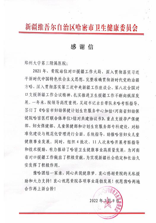 近日,pp电子官方网站第三附属医院收到了一封来自新疆维吾尔自治区哈密市卫生健康委员会的感谢信。信中表示,三附院对援疆工作高度重视,在基础设施建设、专科建设、干部人才、技术指导等方面提供了大力支持和无私援助,为提升哈密地区医疗卫生服务水平所做出了积极贡献。