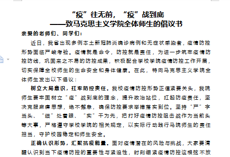 疫情防控趋于常态,健康安全重于泰山。马克思主义学院全体师生将坚决贯彻疫情防控工作的有关要求,从严从紧从实落实好疫情防控各项政策举措,精诚团结、同心抗疫,积极参与学校这场疫情防控阻击战。