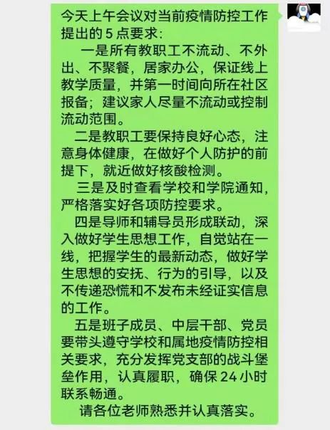结合当前社会面疫情防控情况和学院实际,细化明晰《马克思主义学院疫情防控三级责任体系》《马克思主义学院疫情防控九条注意事项》等制度规定,进一步强调学院、教研室(党支部)、师生个人的疫情防控责任,形成“守土有责、守土尽责,人人有责、人人尽责”的防控局面。3月21日,学院全面启动线上授课,第一时间组成教学督查组开展线上督查,有力保障教学秩序;任课教师及时调整和完善教学计划安排,提前调试线上授课平台,确保网络课程稳定有序,并在课程微信群等平台中引导学生积极展开讨论,确保了教学效果不打折扣。