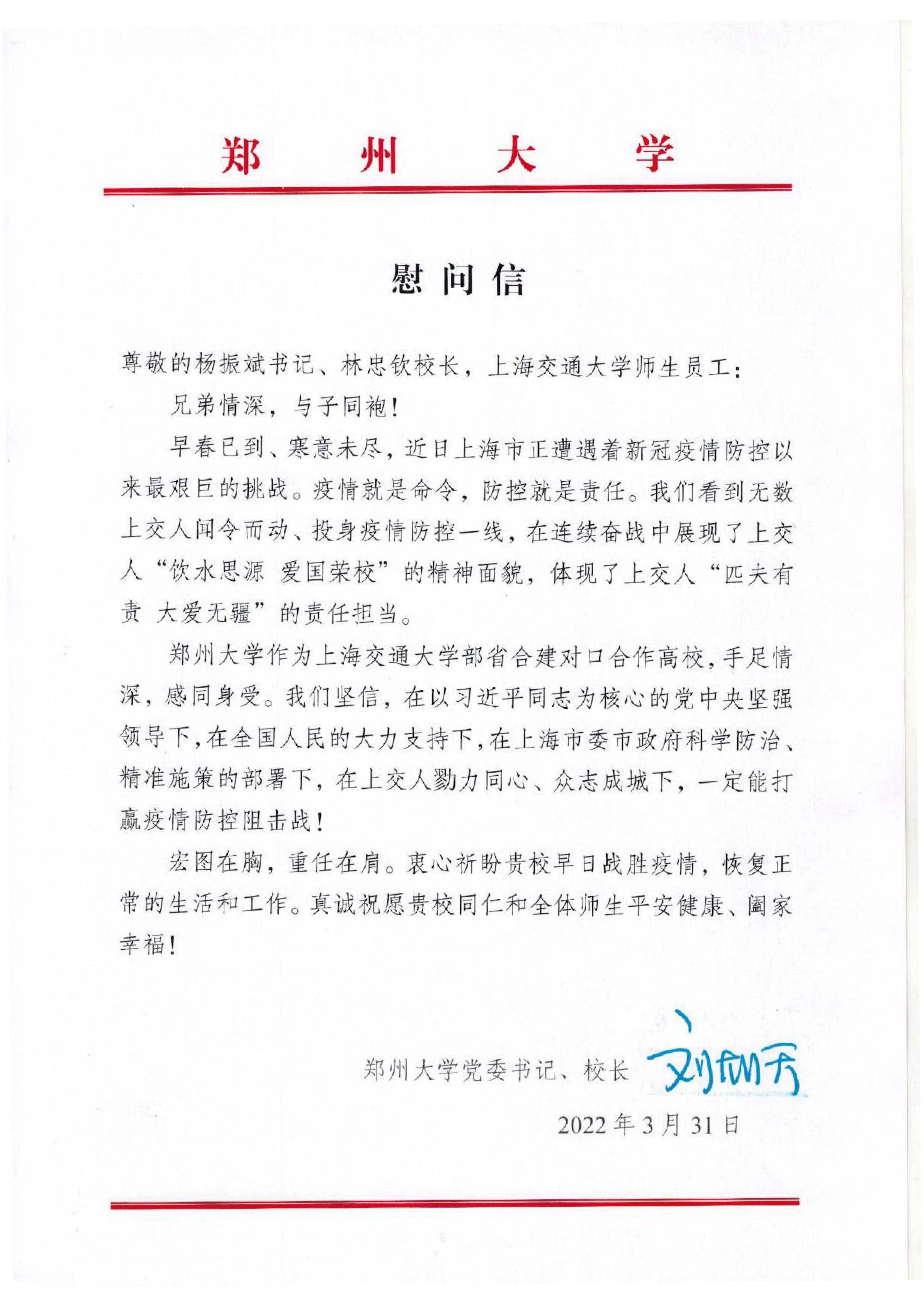 近期,上海市正处于疫情高位流行状态。上海交通大学和pp电子官方网站是部省合建对口合建合作高校,3月31日,省政协副主席、校党委书记、校长刘炯天代表学校,向上海交通大学全体师生员工发去慰问信,衷心祝愿上海交通大学早日战胜疫情,恢复正常生活和工作,真诚祝愿上海交通大学全体师生平安健康、阖家幸福。