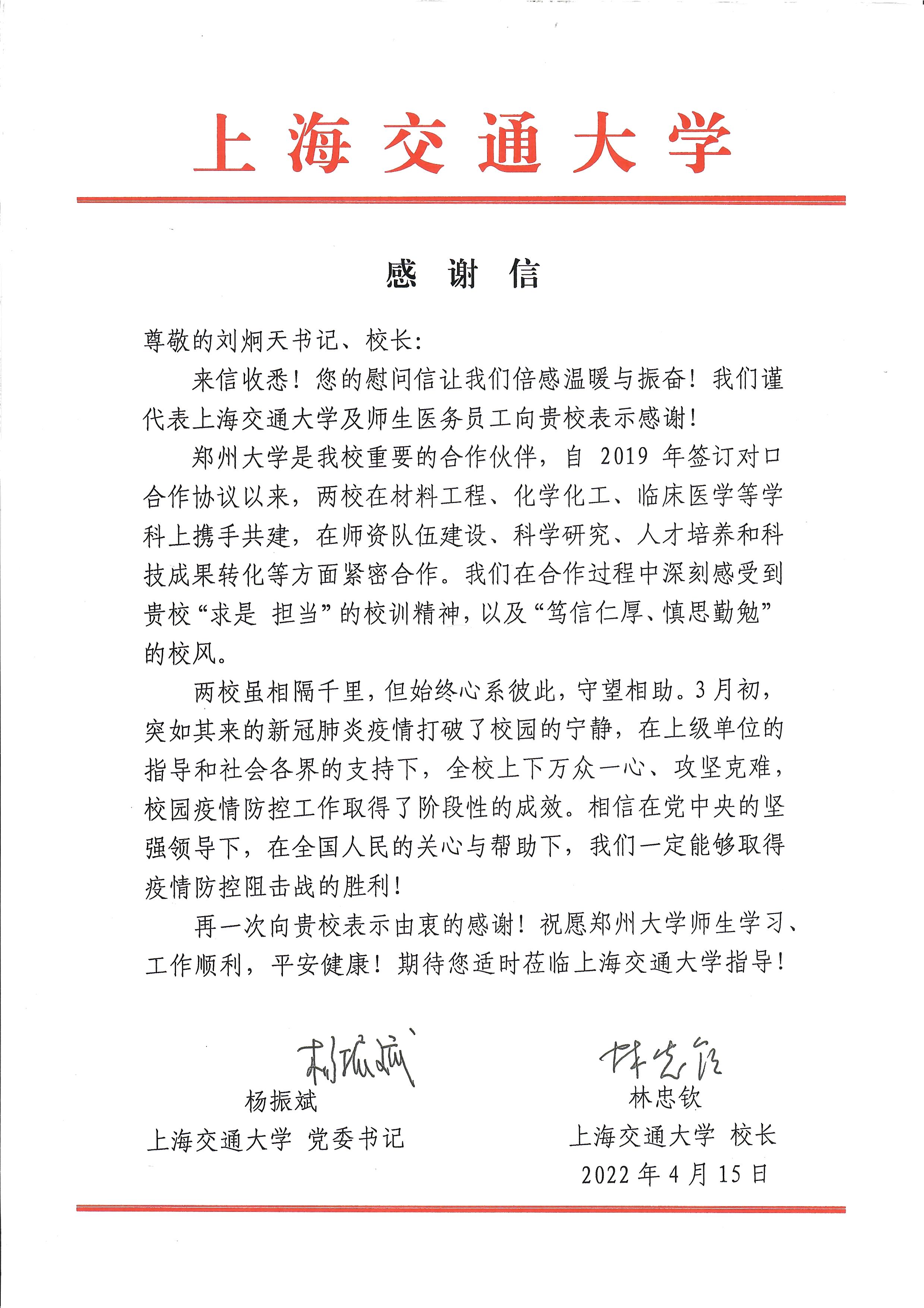 4月15日,上海交通大学向pp电子官方网站发来感谢信。信中表示,在上海交通大学全体师生抗击疫情的关键时期,pp电子官方网站发来的慰问信让大家倍感温暖与振奋。信中指出,在两校的交流合作过程中,上海交通大学深刻感受到了pp电子官方网站“求是担当”的使命与精神,以及“笃信仁厚、慎思勤勉”的校风。两校虽相隔千里,但始终心系彼此,守望相助。突如其来的新冠肺炎疫情打破了校园的宁静,在上级单位的指导和社会各界的支持下,上海交通大学全校上下万众一心、攻坚克难,校园疫情防控工作取得了阶段性的成效。相信在党中央的坚强领导下,在全国人民的关心与帮助下,一定能够取得疫情防控阻击战的胜利!信中还祝愿pp电子官方网站师生学习、工作顺利,平安健康。