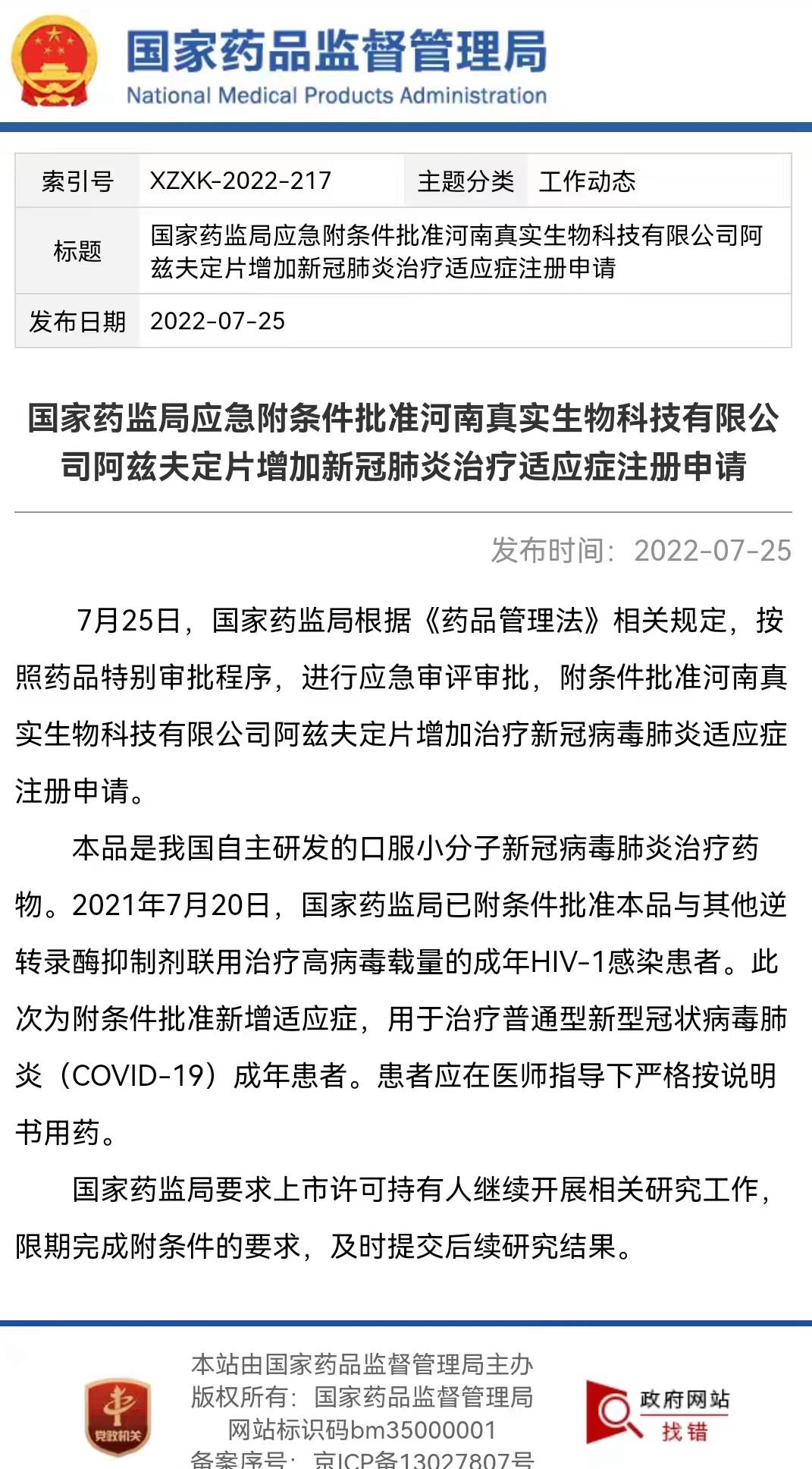 7月25日下午,国家药监局官网公布信息,根据《药品管理法》相关规定,按照药品特别审批程序,进行应急审评审批,附条件批准河南真实生物科技有限公司阿兹夫定片增加治疗新冠病毒肺炎适应症注册申请。这标志着由pp电子官方网站常俊标教授作为发明人,河南真实生物科技有限公司研发的我国首个抗新冠肺炎小分子口服药,在国内外完成Ⅲ期临床试验后,正式获批上市。