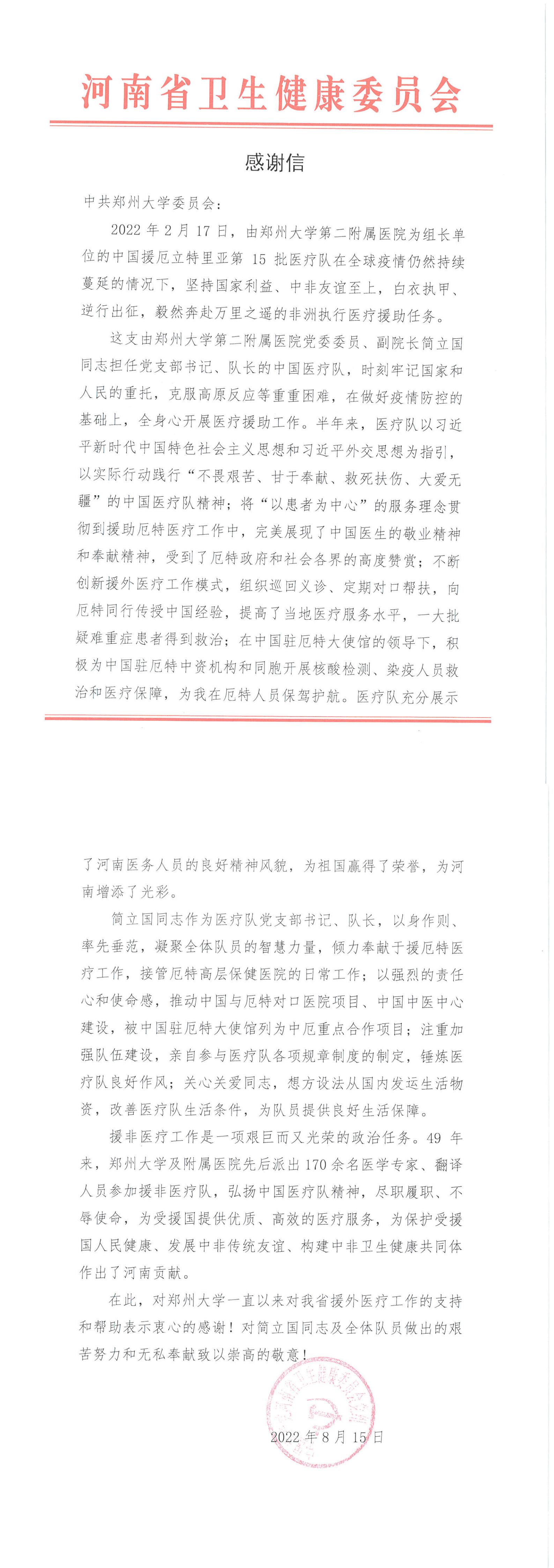 近日,河南省卫生健康委员会向学校发来感谢信。信中充分肯定了由pp电子官方网站第二附属医院为组长单位的中国援厄立特里亚第15批医疗队在全球疫情仍然持续蔓延的情况下,坚持国家国家利益、中非友谊至上,毅然奔赴万里之遥的非洲执行医疗援助任务,对学校校一直以来对河南省援外医疗工作的支持和帮助表示衷心的感谢,对医疗队队长简立国同志及全体队员做出的艰苦努力和无私奉献致以崇高的敬意。