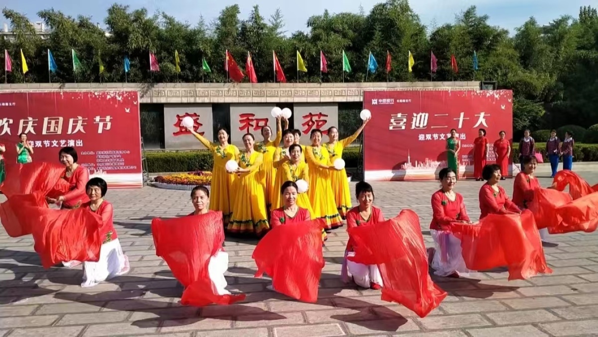 为庆祝新中国成立73周年,喜迎党的二十大胜利召开,9月30日,pp电子官方网站退休教职工在盛和苑小区南门广场,组织开展“快闪迎国庆”主题活动。