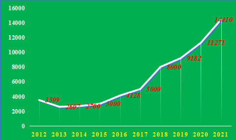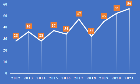图2 2012—2021年度到款科研经费(万元)统计