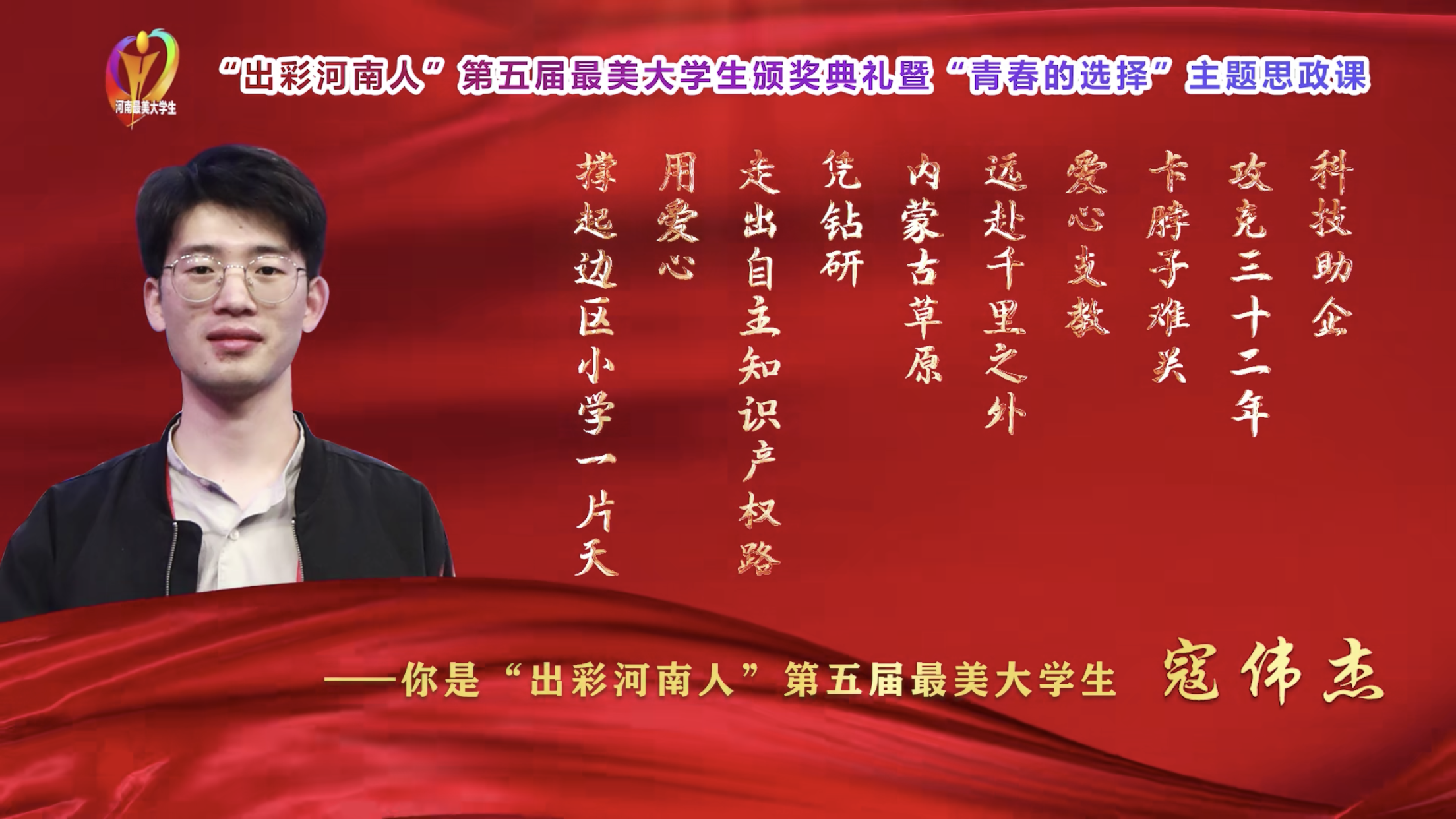 近日,由中共河南省委宣传部、中共河南省委教育工委、河南省教育厅、河南日报报业集团、河南广播电视台、共青团河南省委六部门共同主办的“出彩河南人”第五届最美大学生颁奖典礼暨“青春的选择”主题思政课在河南农业大学举行。全省50万师生线上同步收看这堂特别的思政大课。