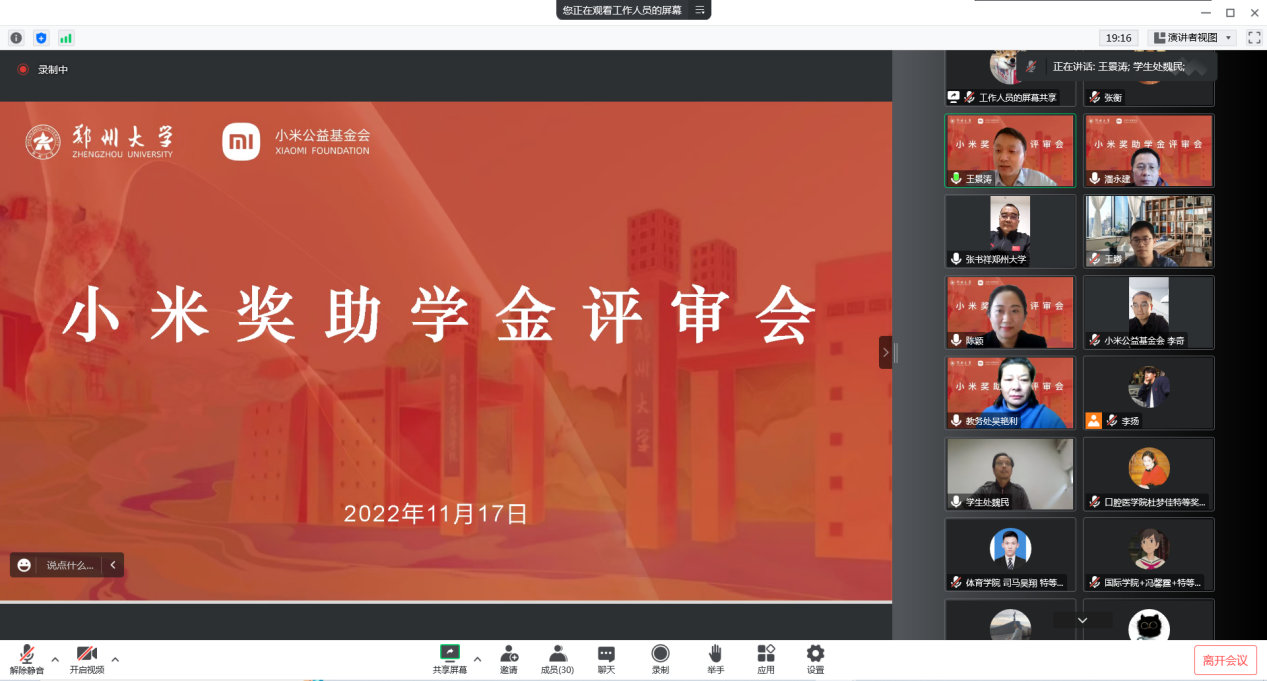近日,2022年度pp电子官方网站“小米奖助学金”评审会在线举行。小米河南省总经理王腾、小米公益基金会项目经理李奇,学校对外联络办公室、教务处、学生处、党委研究生工作部、校团委等部门负责人参与评审。会议由校团委负责同志主持。