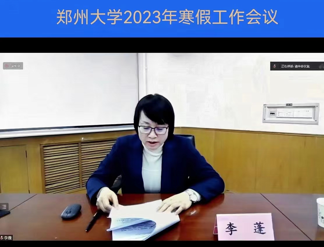 校长李蓬院士讲话。她全面回顾了到任以来重点推动的各项工作,并从坚持党建引领、科研创新体系、教育教学体系、人才队伍体系、社会服务体系、资源管理体系、应急保障机制等方面,梳理总结了2022年学校一流大学建设工作。她指出,过去的一年,面对艰苦卓绝的历史大考,全体郑大人团结一心、众志成城,各项工作取得了令人瞩目的成绩,对全校师生员工奋发有为的精神状态给予肯定,对大家的辛勤付出表示敬意和感谢。她强调,在即将到来的寒假,要适度休息,也要保持工作状态,确保一流大学建设有序推进。一要做好全年工作的收官。对年度各项任务进行全面梳理,在总结成绩、凝练经验做法的同时,坚持问题导向,形成问题清单和任务清单,认真做好年度考核,做好考核结果运用,充分发挥考核的指挥棒、风向标、助推器作用,树立改革创新、干事创业的鲜明导向;二要做好2023年重点工作谋划。围绕一流大学建设主线,突出目标导向,统筹推进学科、人才、项目一体化建设,围绕“四新”学科开展多学科、跨学院有组织科研;三要保持假期期间工作状态。持续做好新形势下的疫情防控工作,为留校学生提供全面的服务保障,严守各项纪律,严格按照“党政同责、一岗双责、失职追责”的要求抓好安全稳定工作,有针对性地开展扶贫助困和走访慰问活动,确保广大师生度过一个平安、祥和的“暖冬”。