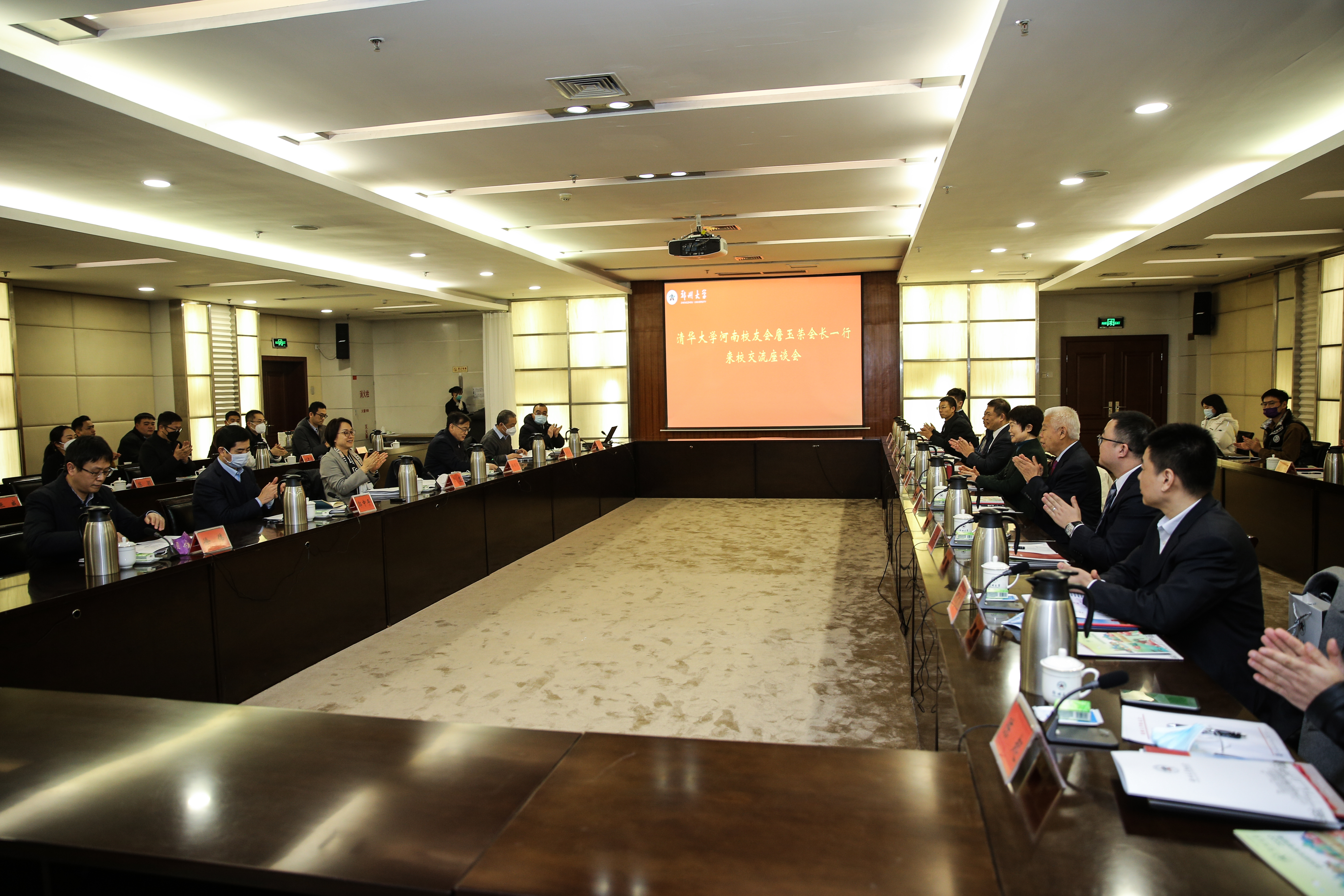1月30日,清华大学河南校友会会长、河南省人大教科文卫委员会原主任詹玉荣一行来校交流。校长李蓬院士,校党委常委、副校长韩国河出席座谈会。校长办公室、人事处、对外联络办公室、招生办公室等相关单位负责同志,学校教师代表、清华大学师生代表参加会议。座谈会由韩国河主持。