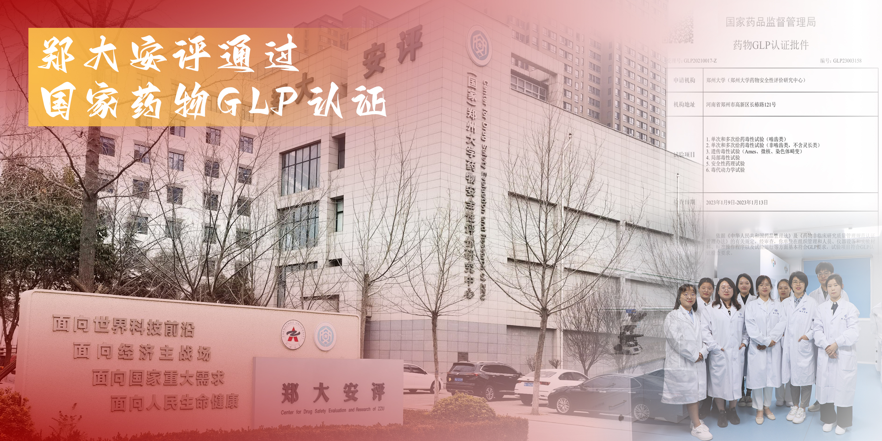 郑大安评始建于2004年。2009年,其4项试验通过国家GLP认证。2010年,因市政工程改造原因迁址至pp电子官方网站主校区建设。2020年,为加速河南省生物医药产业的发展,打通产业链,河南省下发《2020年度河南省生物医药产业发展工作方案》,揭榜挂帅郑大安评尽快通过国家认证,由省药监局、省科技厅、省教育厅、省发改委以及pp电子官方网站等单位作为建设责任单位。2021年9月,郑大安评正式提交GLP认证申请,并于当年12月接受国家专家组的现场检查。2023年1月,郑大安评再次接受国家专家组的现场检查。最终,经过三年的艰苦奋斗和不懈努力,郑大安评顺利通过国家GLP认证。