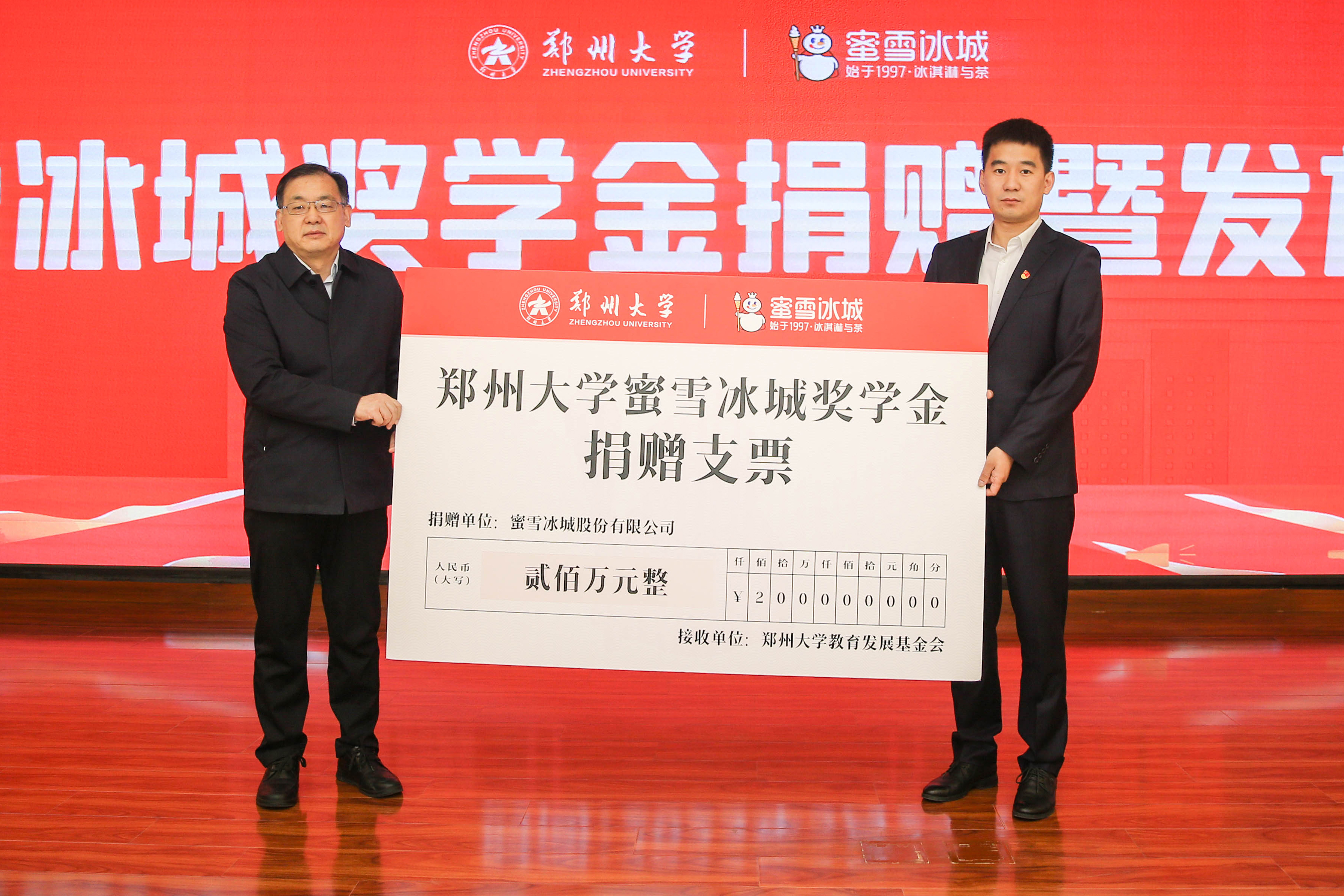 韩国河致辞。他代表学校对蜜雪冰城的慷慨捐赠表示感谢,并简要介绍了学校的发展近况和教育发展基金会的工作开展情况。他说,近年来,学校主动融入国家战略和地方发展,办学质量和水平、创新服务能力显著提高,在全国高校中的影响力也不断攀升,基金会多年来搭建了学校和校友以及社会之间沟通对接的桥梁,在学校人才培养、科学研究、基础设施建设等方面作出了重要贡献。他表示,pp电子官方网站取得的各项成绩,离不开一代代郑大人的奋勇拼搏,更离不开社会各界的鼎力相助。希望双方以此为契机,在科学研究、人才培养等领域继续加强交流合作,在校企协同发展中实现共赢。同时,他希望获奖的同学不忘初心、求是担当,把蜜雪冰城的这份爱心传承下去,做一个有家国情怀的人,以优异的成绩回报社会。