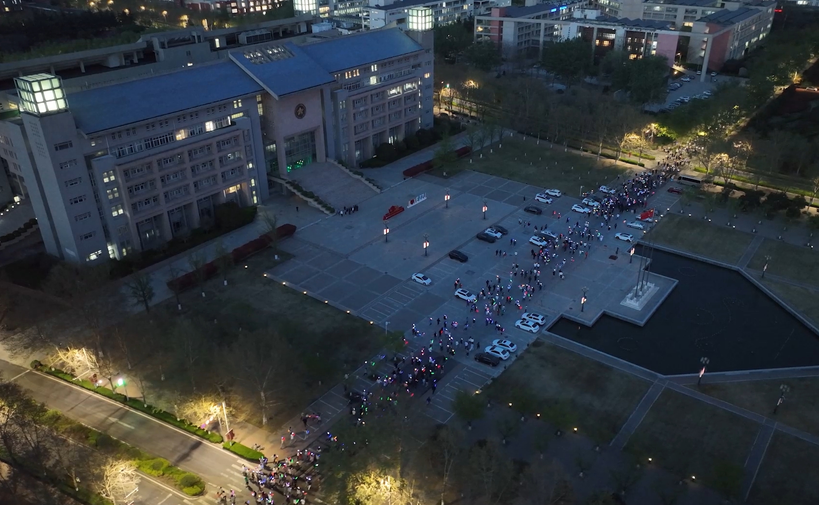 本次夜跑活动由“共筑一个梦”签到打卡、“共绘一幅画”航拍、“共赴一条路”荧光夜跑和“共览一场景”荧光灯会四部分组成,全程3.5公里。活动开始前,同学们齐聚南操场打卡签名,并用他们佩戴的荧光头饰、荧光棒、手环等组成“ZZU”和“RUN”的字样。19时,在紧张而热烈的气氛中,吴宏阳按动发令枪,夜跑准时开始,同学们挥动各色荧光棒出发,汇成一条耀眼的星河。在夜跑结束后的荧光灯会上,吴宏阳和参与活动的师生们一同猜灯谜,重温党史知识。
