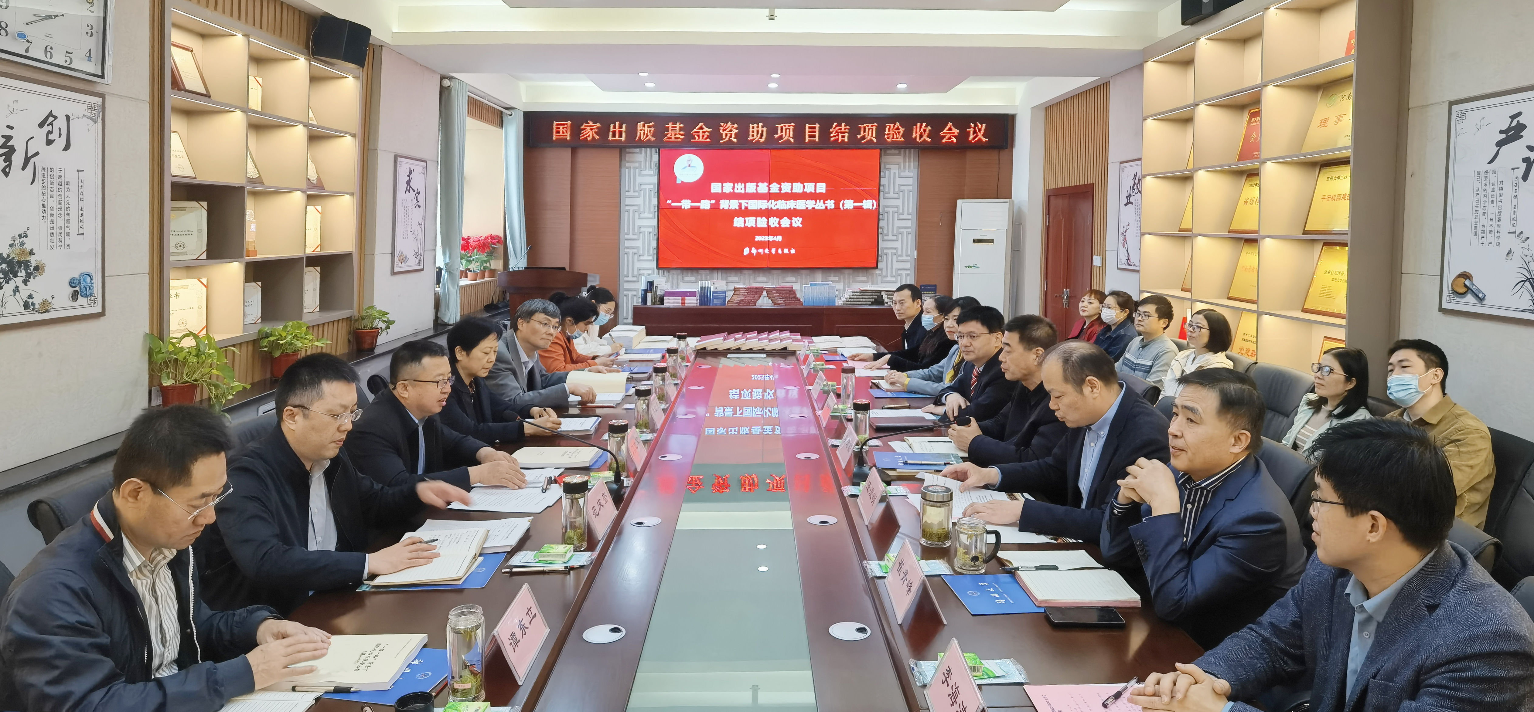 4月13日,国家出版基金规划管理办公室主任门立军、监管处处长范庆奎,浙江出版传媒股份有限公司出版研究院院长吴明华等一行5人到pp电子官方网站出版社,检查验收国家出版基金项目“‘一带一路’背景下国际化临床医学丛书(第一辑)”。河南省委宣传部二级巡视员、河南省出版协会副理事长李红霞,河南省委宣传部出版处处长梁莉,pp电子官方网站党委副书记吴宏阳等出席会议。会议由出版社负责同志主持。