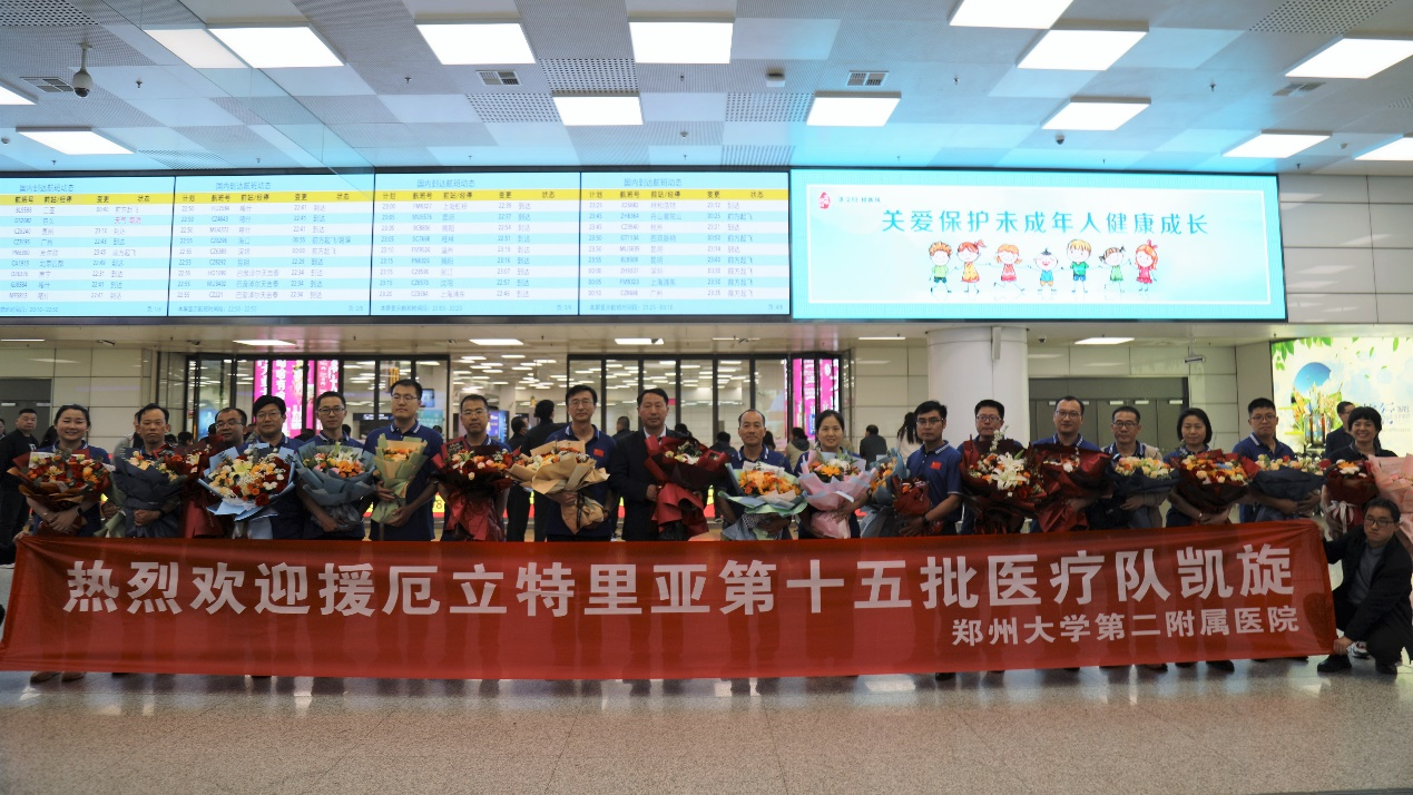 4月21日,由pp电子官方网站第二附属医院为队长单位的中国援厄立特里亚第15批医疗队,圆满完成为期14个月的医疗援助任务载誉归来,抵达新郑国际机场。省卫健委相关负责人、二附院党政班子成员及职工代表来到机场,迎接他们回家。
