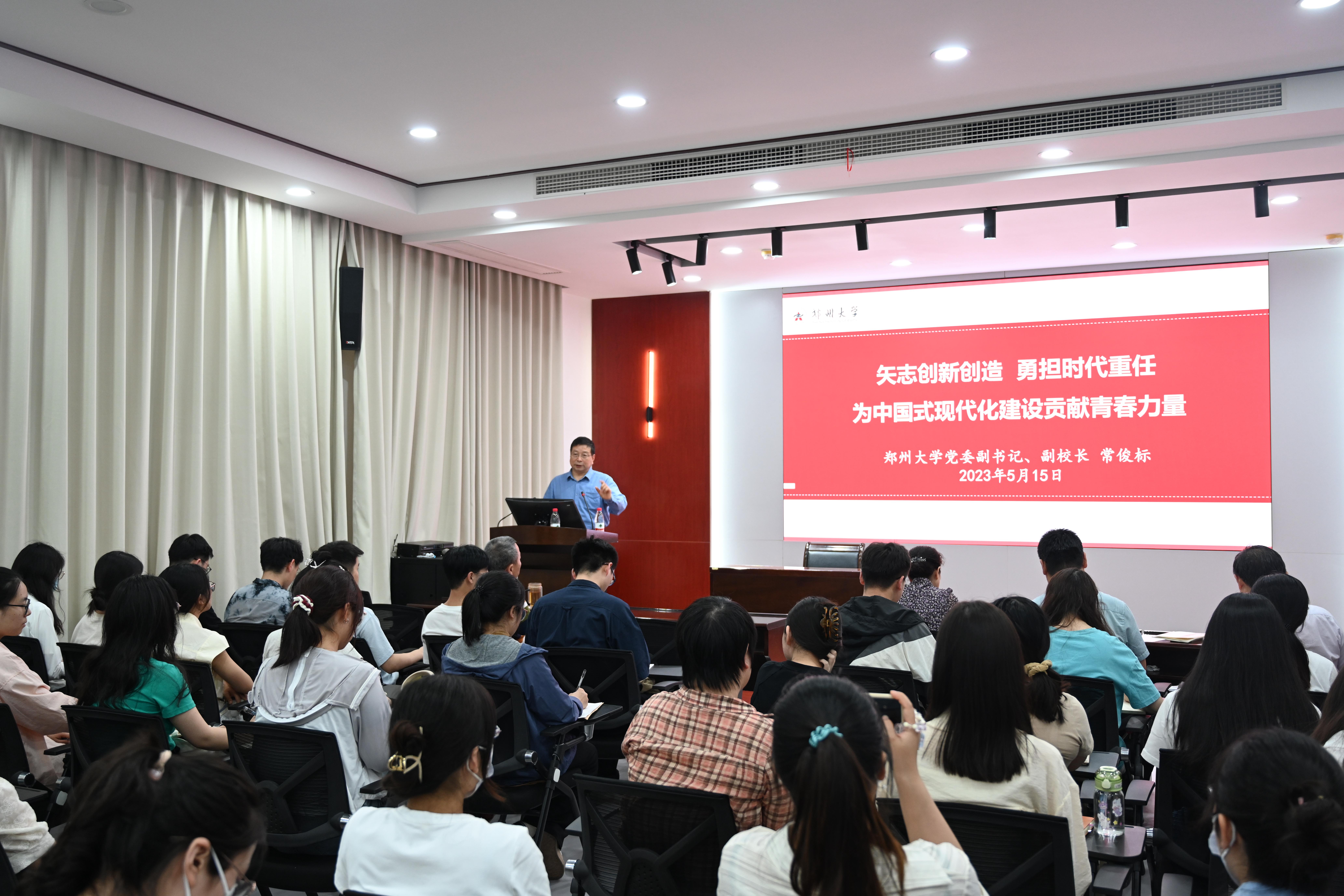 常俊标以“矢志创新创造、勇担时代重任,为中国式现代化建设贡献青春力量”为题,围绕“为什么要走中国式现代化道路?”“什么是中国式现代化?”和“如何在推进中国式现代化中贡献青春力量?”三个问题展开阐述。他指出,要从“百年未有之大变局”深刻认识当今世界的发展变化,要从“两个结合”,即“坚持和发展马克思主义,必须同中国具体实际相结合、同中华优秀传统文化相结合”深刻认识马克思主义中国化时代化新篇章坚持和发展马克思主义,要从“两个一百年”奋斗目标深刻感受中国共产党的使命任务,全面解读了走中国式现代化道路的必要性。他进一步从中国式现代化的特色、中国式现代化的本质要求、到2035年我国发展的总体目标和中国式现代化前进道路上必须把握的重大原则等几个方面系统回答了什么是中国式现代化。