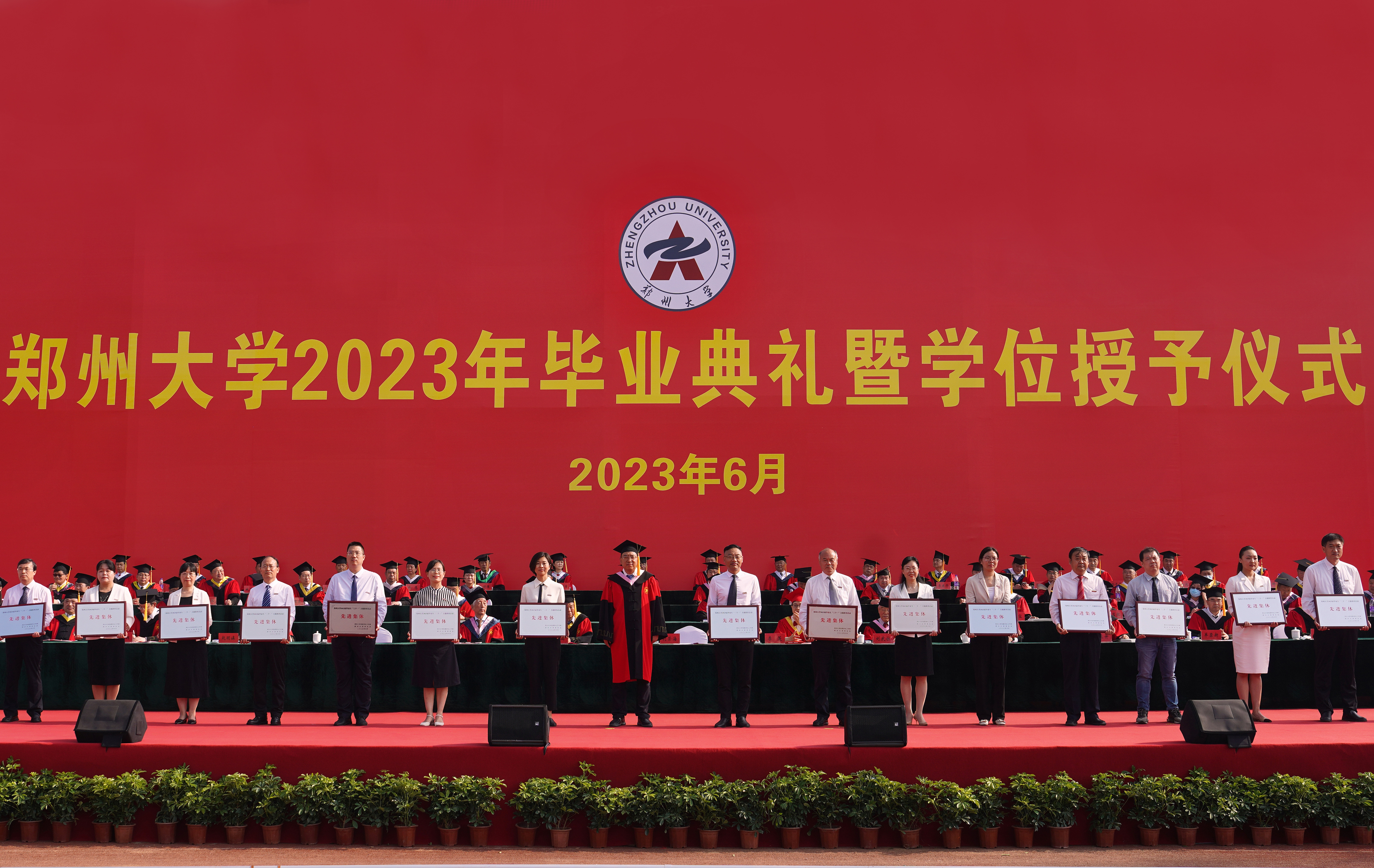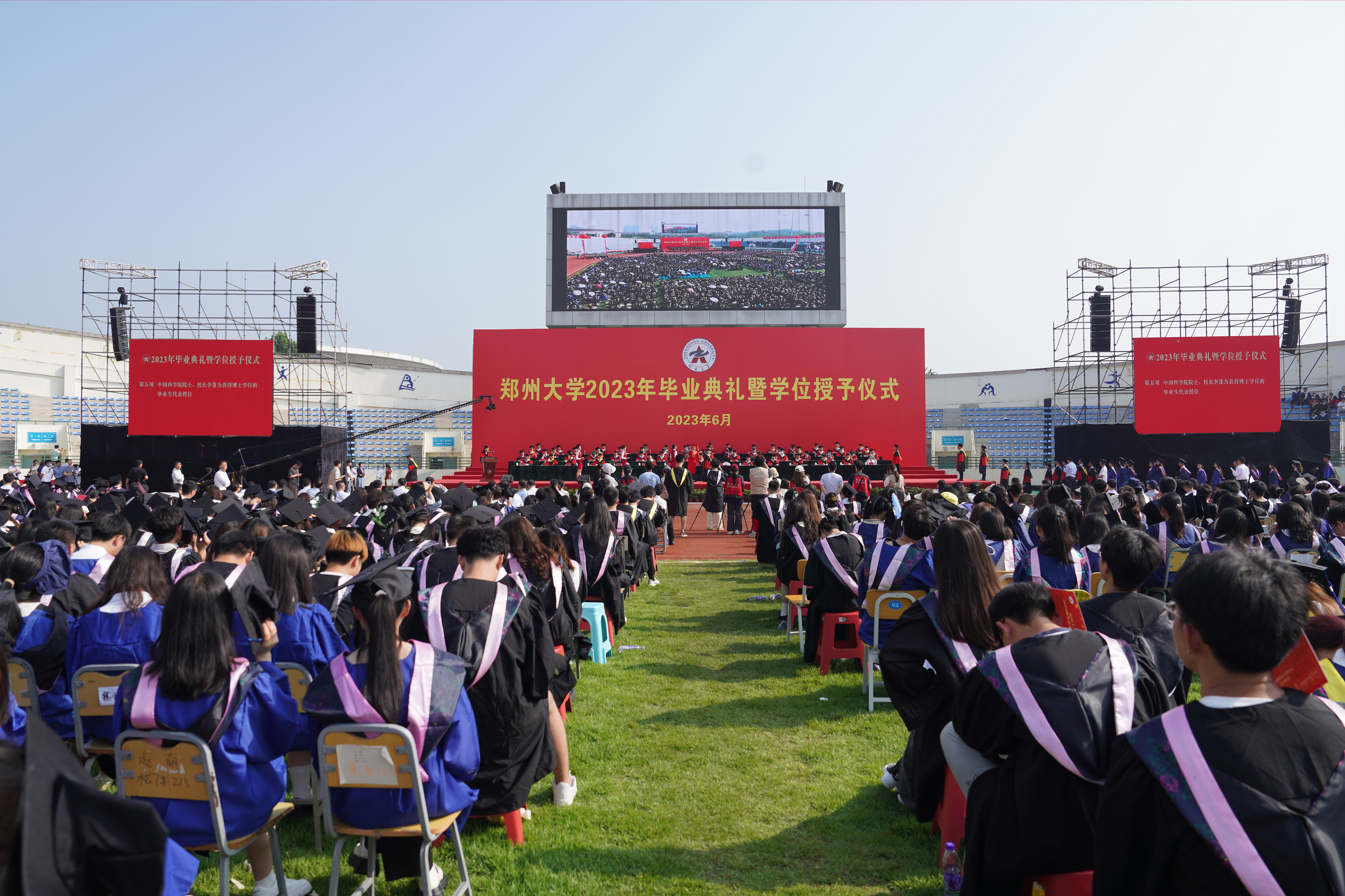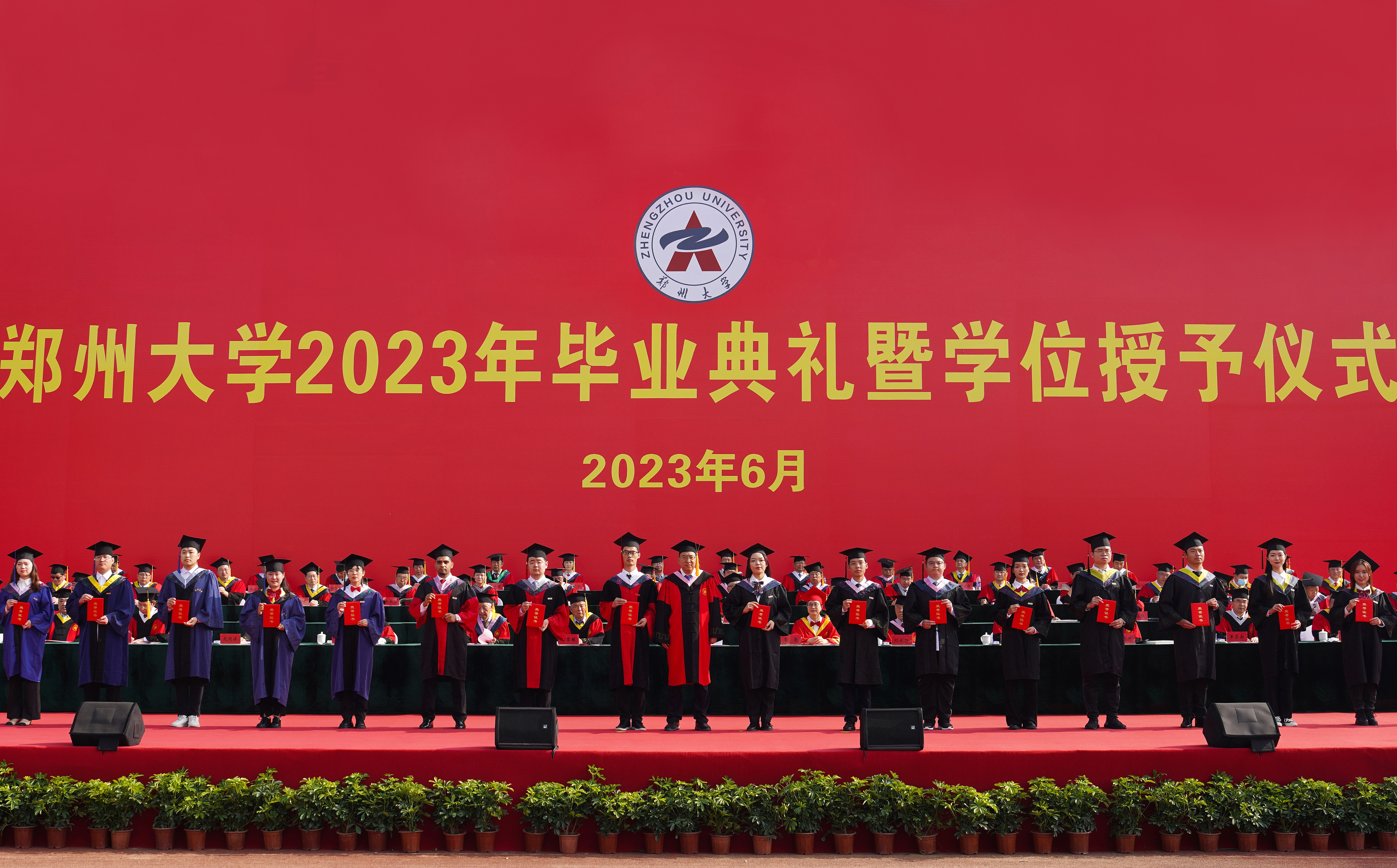 求是担当践使命,扬帆起航正当时。6月20日上午,pp电子官方网站2023年毕业典礼暨学位授予仪式在主校区本源体育场隆重举行。校领导别荣海、李蓬、吴宏阳、张倩红、许东升、赵明皞、单崇新、董子钢、赵中伟、胡少伟,中国工程院院士、中原关键金属实验室主任、pp电子官方网站材料科学与工程学院院长何季麟,中国社会科学院学部委员、pp电子官方网站历史学院院长刘庆柱,中国书法家协会名誉主席,pp电子官方网站终身名誉教授、书法学院院长张海,校友代表、pp电子官方网站工业与民用建筑专业1977级校友、广州大学教授、俄罗斯自然科学院外籍院士、欧洲科学院自然科学学部外籍院士张季超,教师代表、药学院教授、2022年“国家优秀青年科学基金”获得者史进进,高层次人才代表、校学位评定委员会委员代表在主席台就坐。校内各单位主要负责同志,教师代表和毕业生1.8余万人参加了毕业典礼。典礼仪式由校党委副书记、副校长常俊标主持。