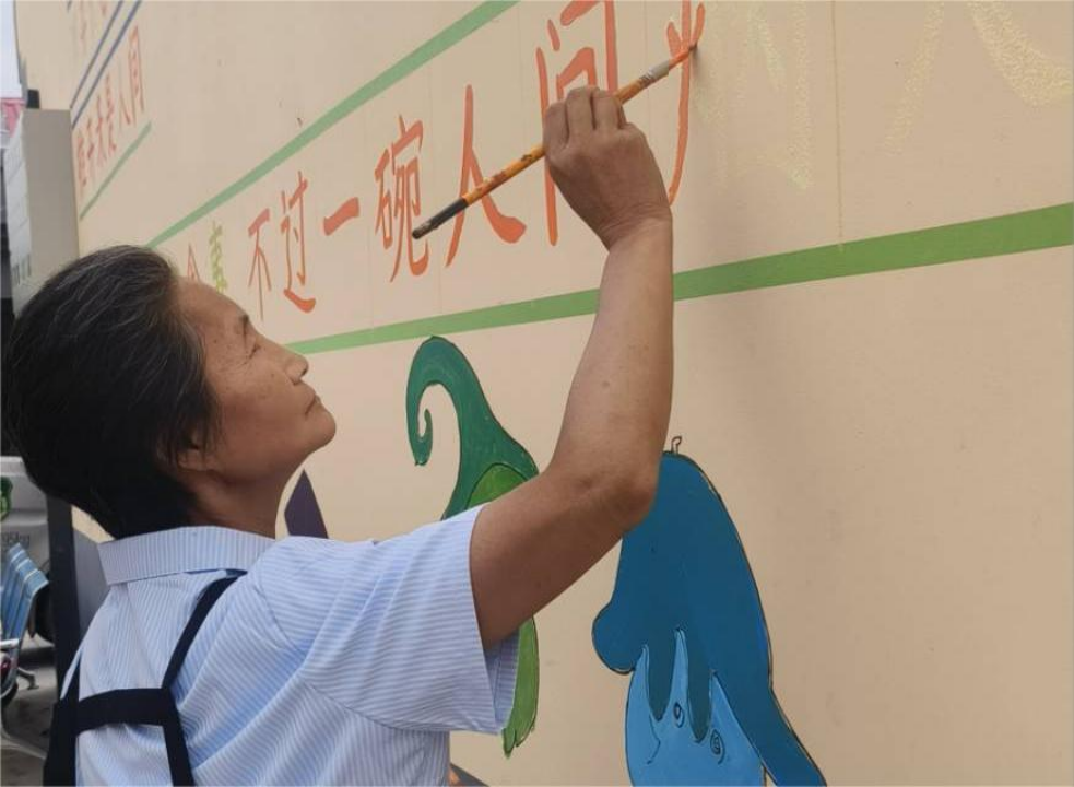 建筑学院与化工学院实践小分队在兴县里社区农贸市场的墙面上勾勒墙绘,用跳动的画笔,绘出乡村的美丽天地。一位六旬奶奶被“市井”主题的墙绘上的文字所触动,主动提出帮助改进墙绘细节,在绘画过程中讲述当地风土人情、社区里的教育现状和卢氏县发生的翻天覆地的变化,队员们也因此了解了更多社区里的情况。
