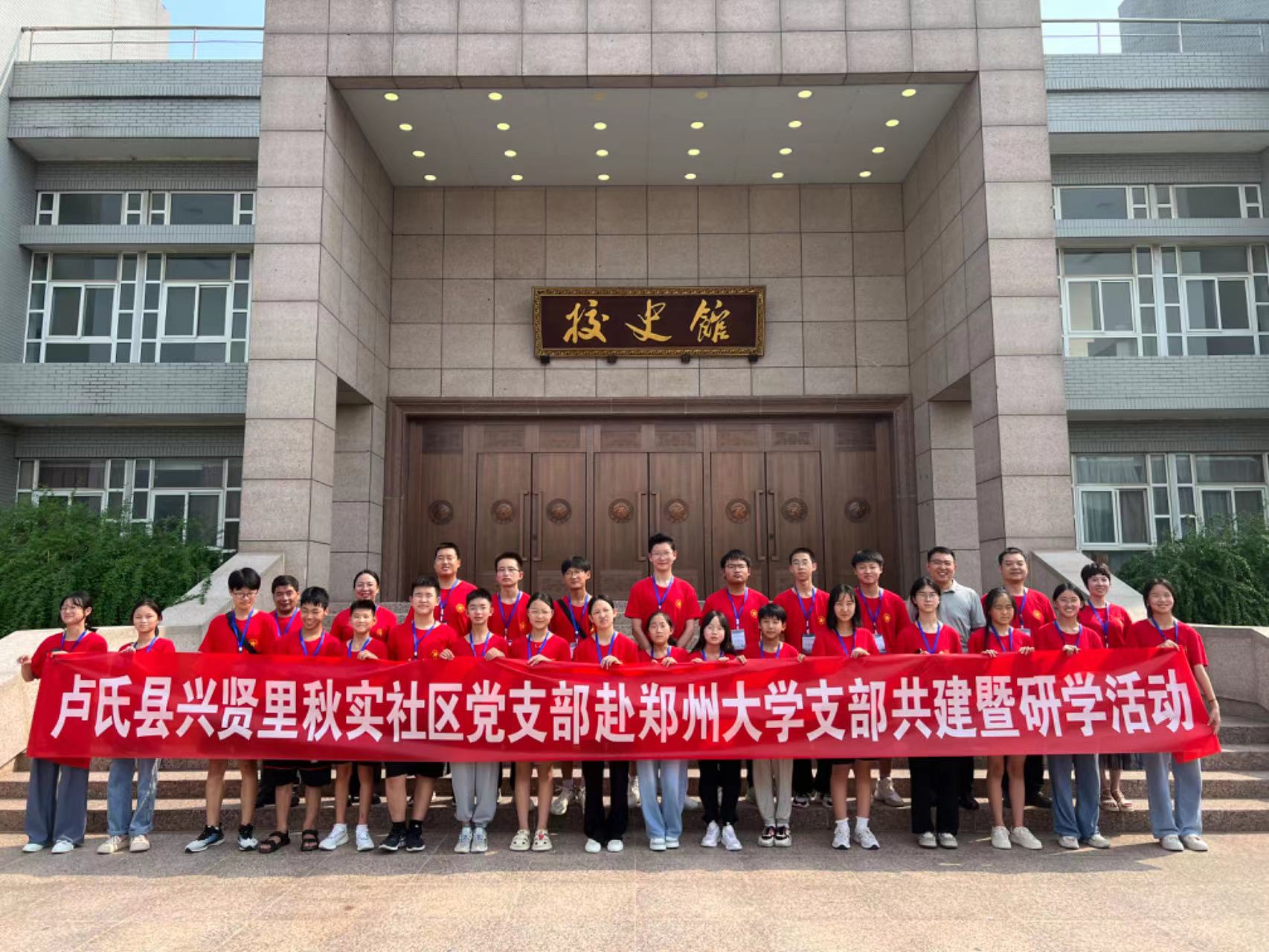 研学团先后参观了校史馆、中原关键金属实验室、图书馆、药学院标本馆、现代分析与基因测序中心、化工学院实验室等。期间,化工学院化学工程与工艺系党支部与兴贤里秋实社区党支部联合开展了党建共建活动,秋实社区党支部回赠了在兴贤里社区升起的第一面五星红旗(兴贤里国旗台由化工学院化学工程与工艺系党支部捐建)。化工学院王景涛教授、王利国教授分别以《能源的分类与简介》《科技改变“你我他”》为题给研学团成员作了精彩的科普报告,并鼓励研学团成员踏实学习、奋发图强、成才报国。研学团一行参观了河南省博物院,深切感受到中原文化的厚重,领略华夏文明的博大精深。