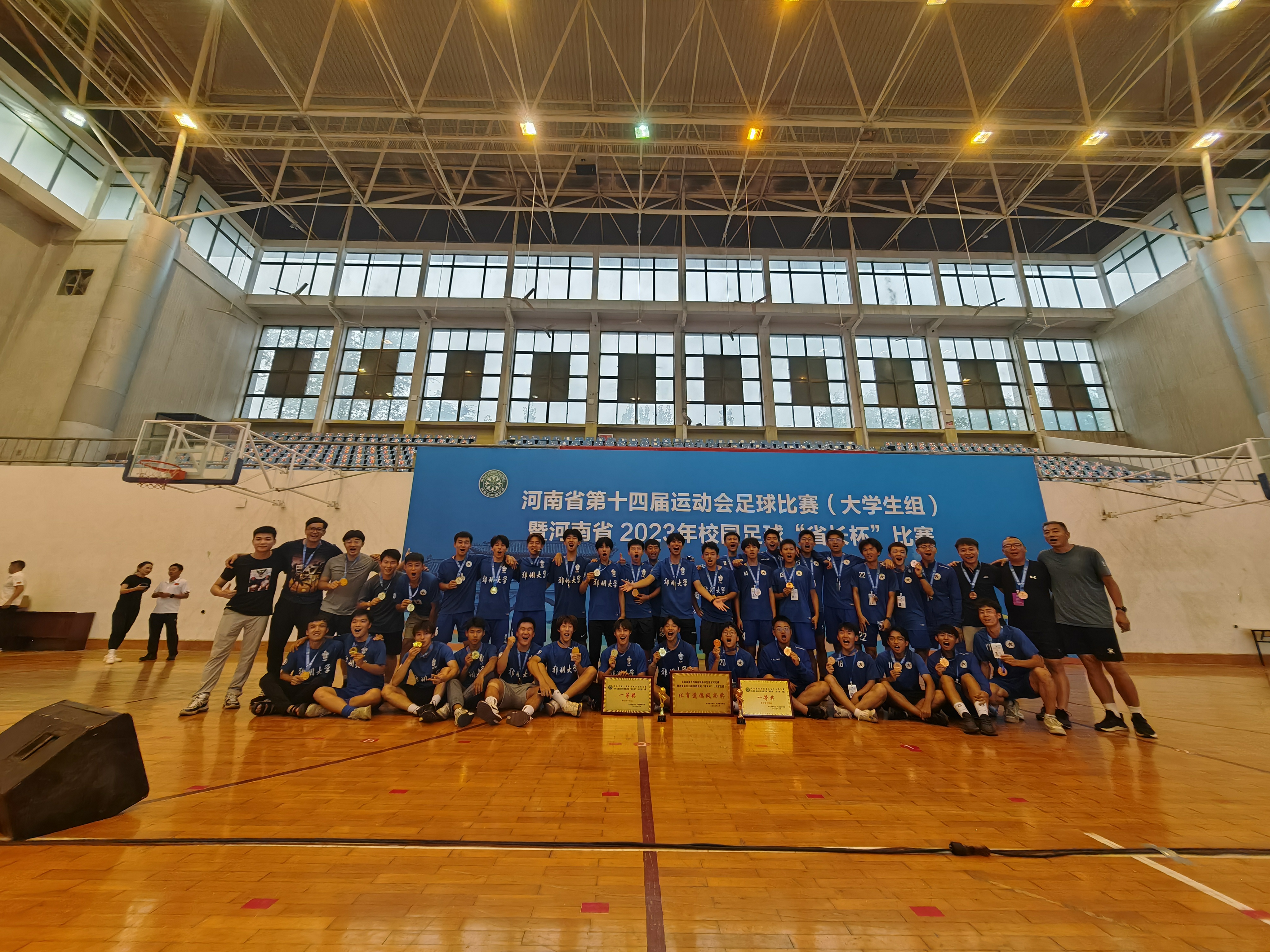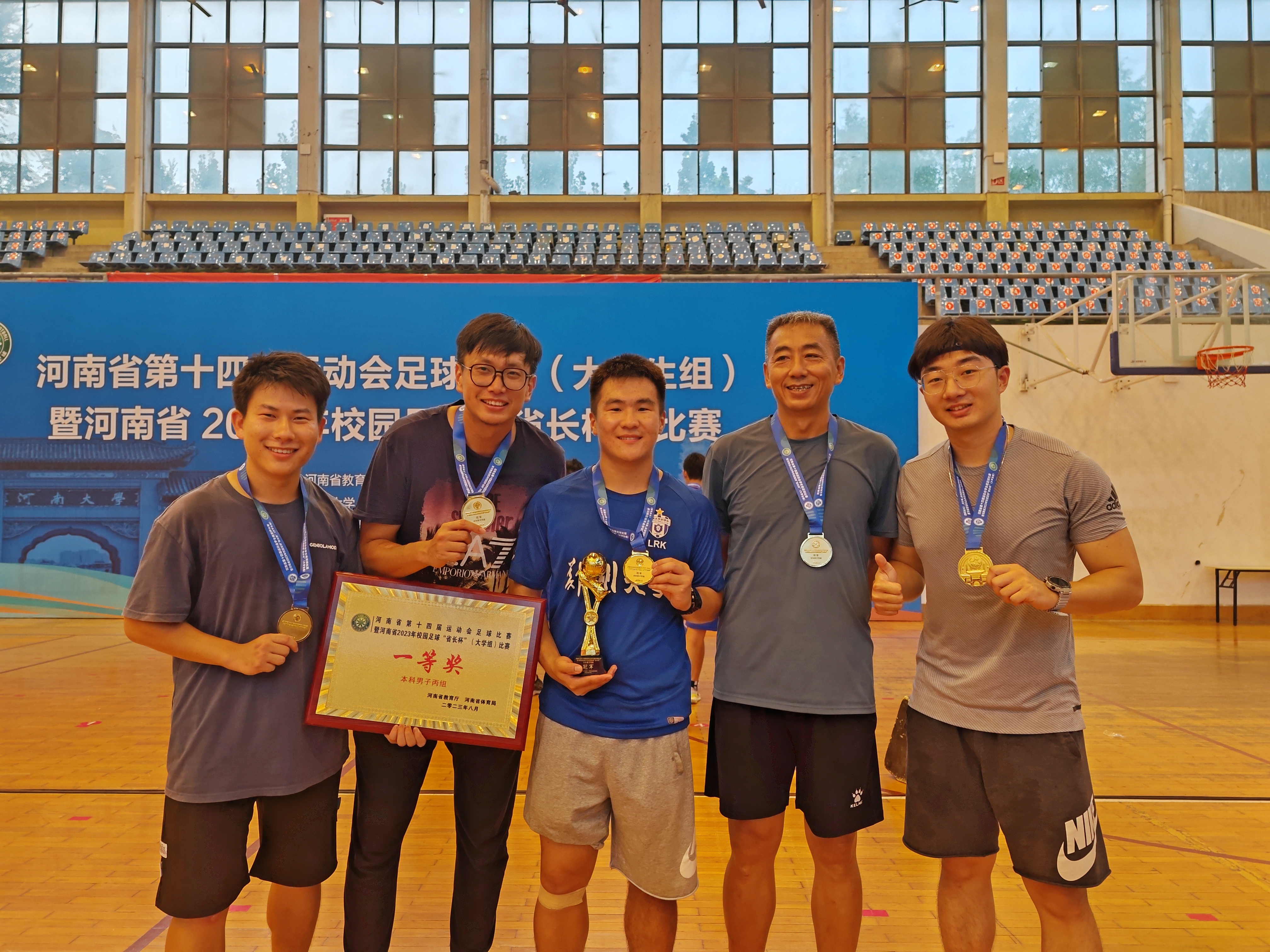 8月14—19日,由省教育厅、省体育局主办,省校足办等单位承办的河南省第十四届运动会学生组足球比赛暨河南省2023年校园足球“省长杯”(大学生组)比赛在河南大学举行,来自全省高校的19支足球代表队参赛。pp电子官方网站运动健儿团结协作、奋勇拼搏,获得了本科男子丙组一等奖(冠军),本科男子甲组一等奖(季军)的好成绩。本科男子甲组还获得本届运动会(大学生组)唯一的体育道德风尚奖,李昱泽、王城卫、杨文卓、张贤刚四名同学获得优秀运动员,牛岭老师获得优秀教练员称号。